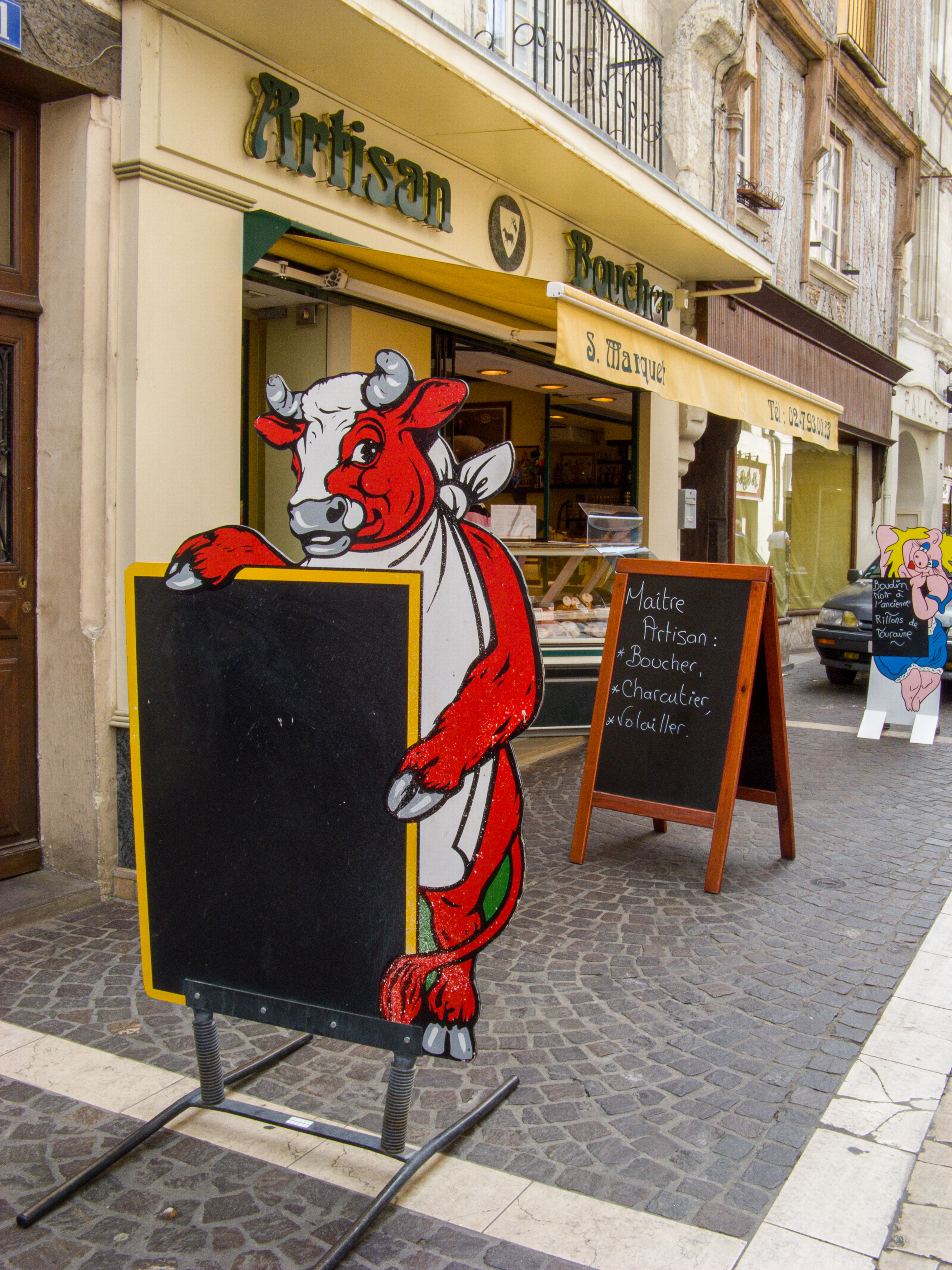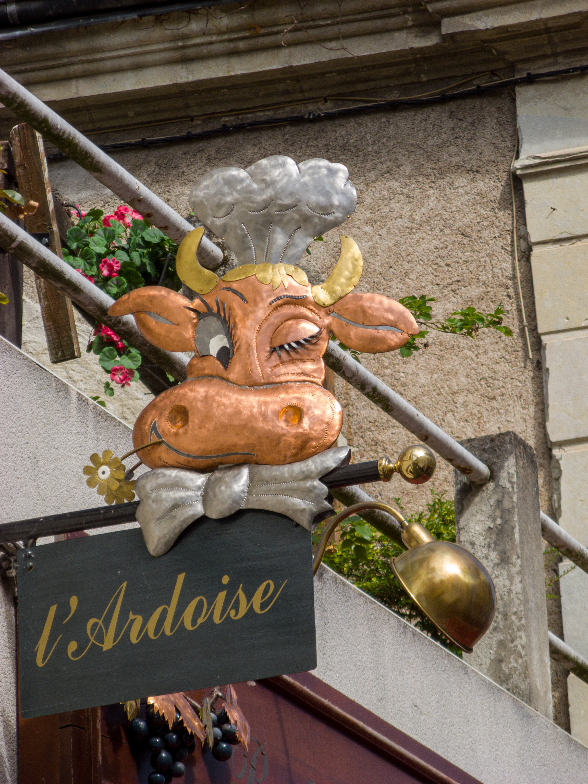 Chinon was rather a letdown, or perhaps I just wasn’t in the right mood for it. My favorite things in the town were the playful black and white cat sticking his paws through the wrought iron gate and the funny signs outside the butcher shops. Oh, and the ice cream was good, too.