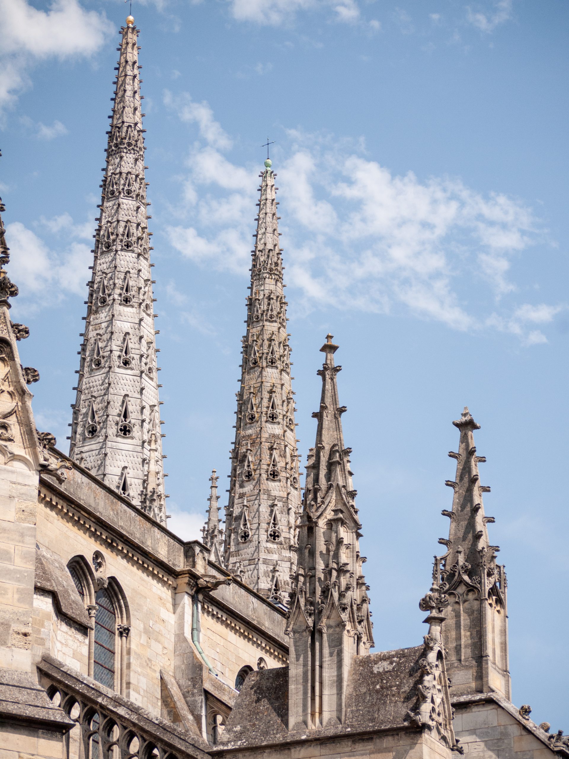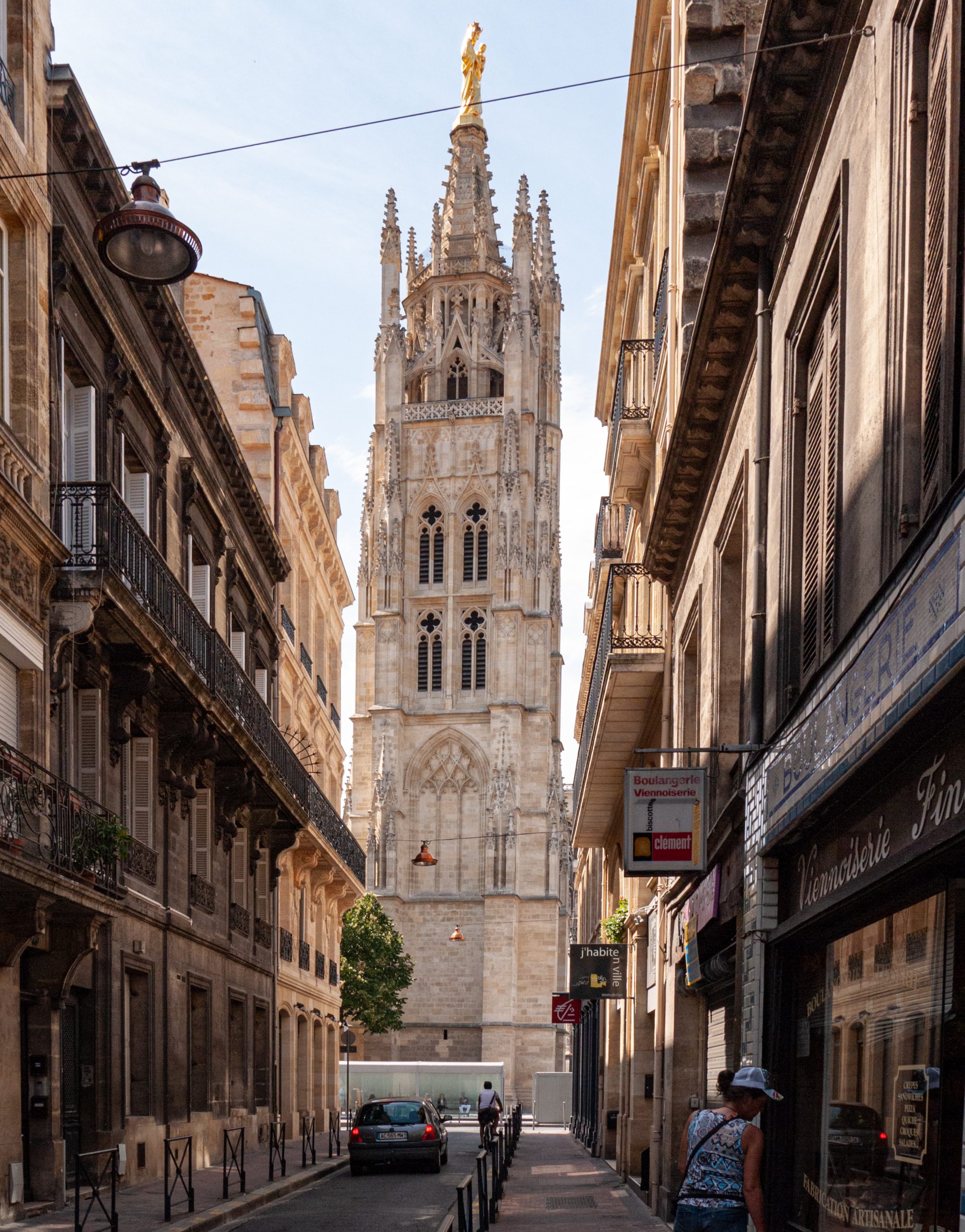 We arrived in Bordeaux shortly before noon and were welcomed by the 100 degree heat. Eeeeuuuuw, nasty hot! Since our room was not yet ready at the hotel, we dumped our stuff there and rode the streetcar to the center of town where we walked slowly on the shady side of the streets and spent a goodly amount of time in the blissfully air-conditioned department store Galeries Lafayette.
