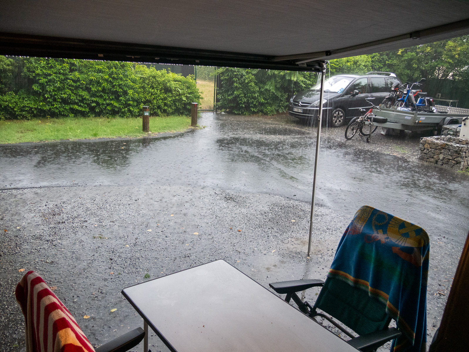 Auf einmal zogen graue, dunkle Wolken auf und es begann zu regnen und gewittern. Bis es prasselte und am Boden Wasser stand und wir eiligst das Innere aufsuchten. Oh, je im WoMo gings ja noch, aber die Radler mit Zelten oder die mit den Hunden. Da must schon Campingfan sein, dass dir nicht jegliche Lust vergeht. Sara schrieb Blog, ich Fussball gestreamt und in die Heija. „Romantik pur, für uns juuung Verliebte“.
