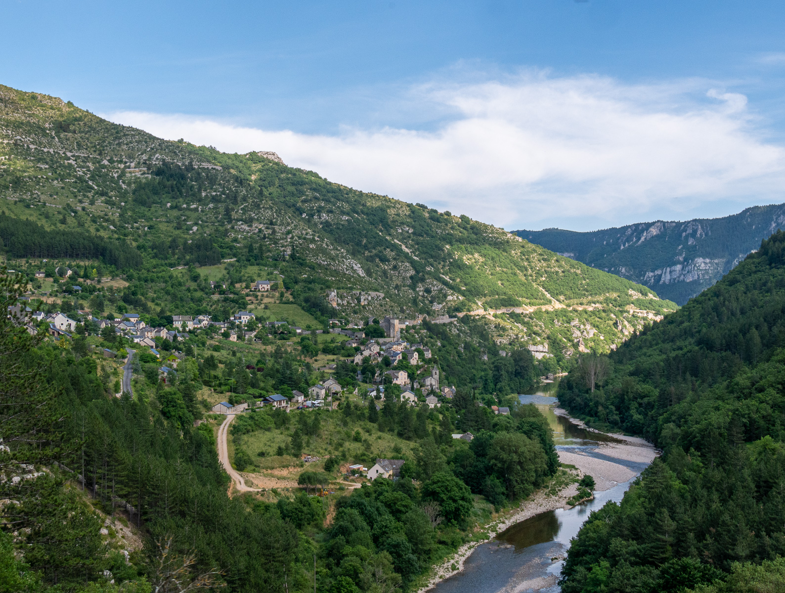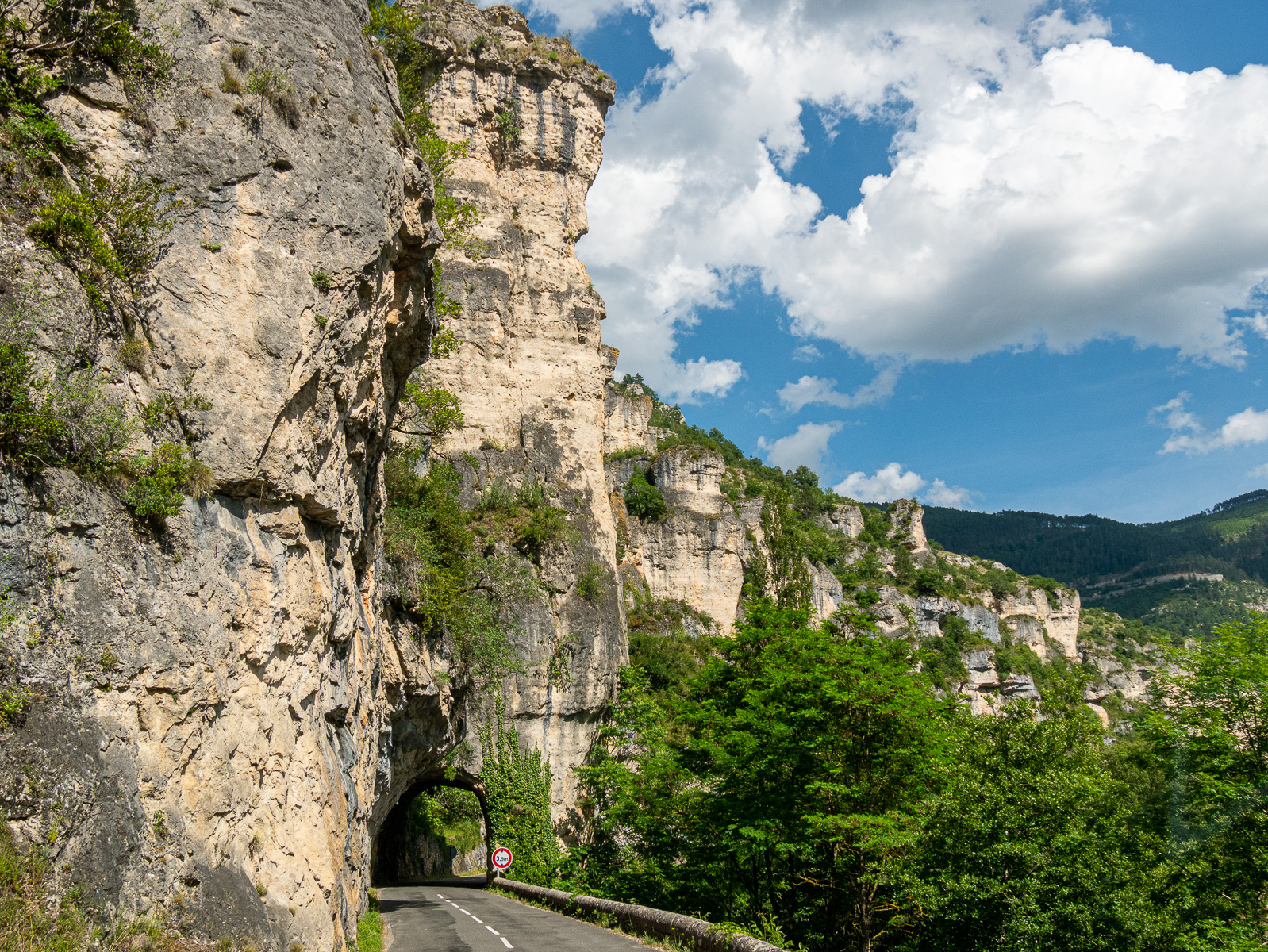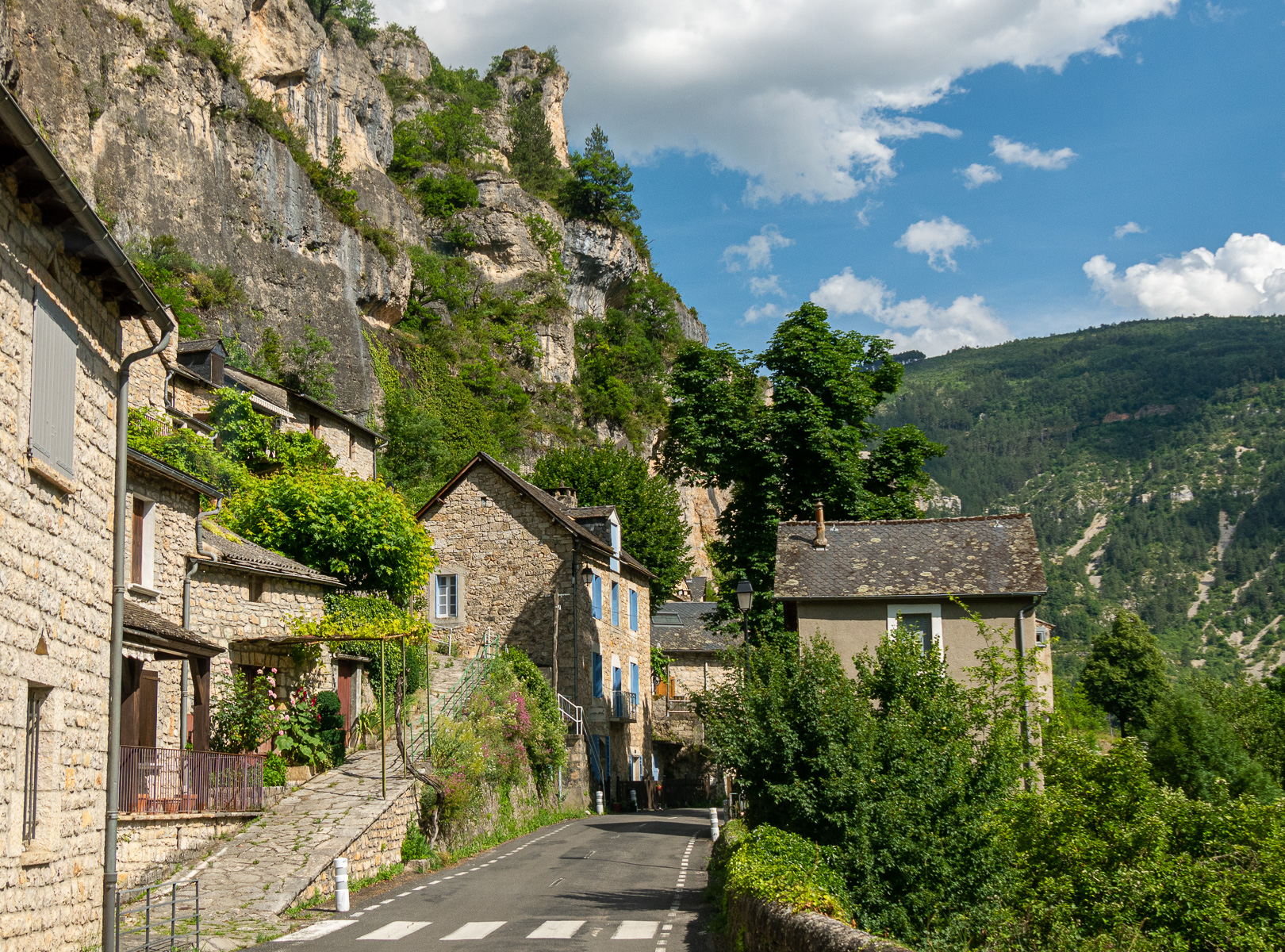 We had a lot of plans for the day so we got up at 8, didn’t linger over breakfast and by 9:45 were on the bikes heading out for a short ride. For years, we’d been hoping to ride our bikes in the Tarn Gorges and now the time had come. Over the previous day or two we accepted the reality that this area is not ideal for our kind of biking – no bike trails, only the narrow, curvy, non-flat road shared with RVs and motorcycles. In light of this, we decided to keep our tours short (10-20km per direction) so that at least we could get a taste of the experience.