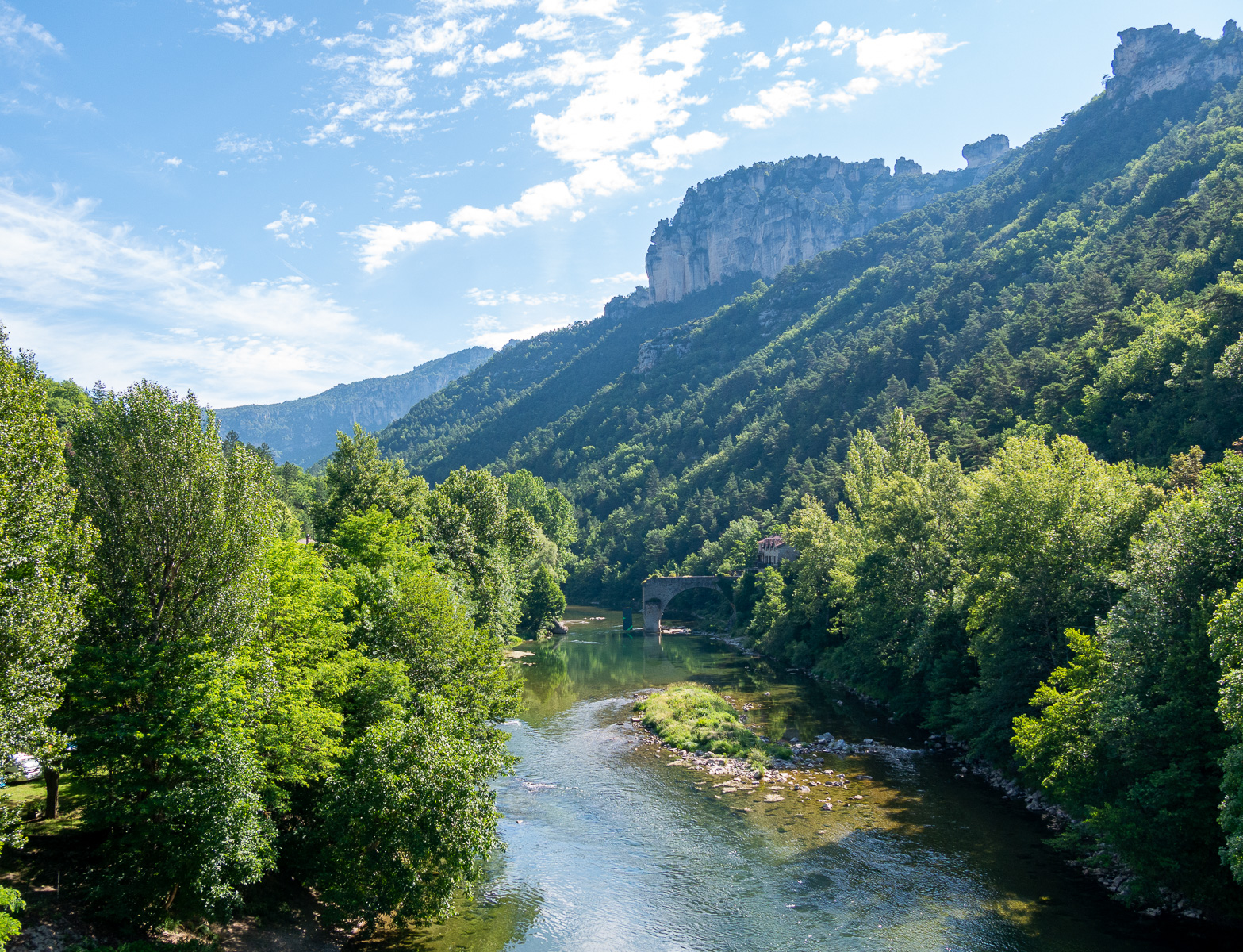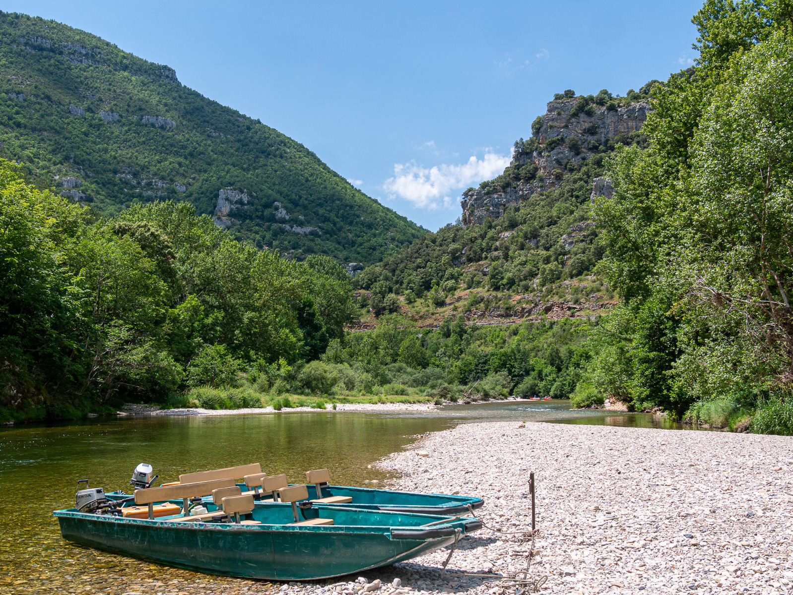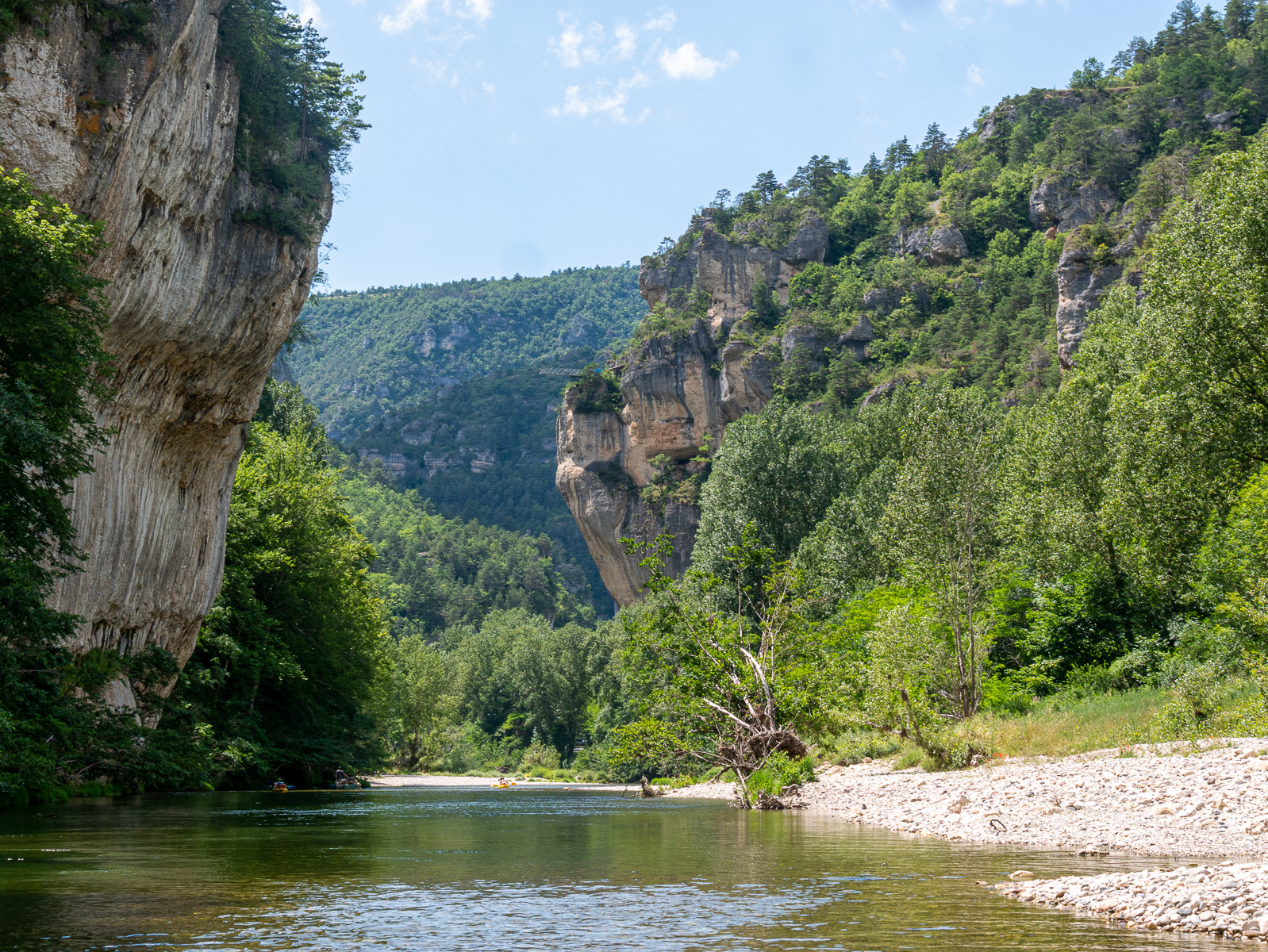 Tatsächlich früh aus dem Bett gekommen, schnelles Frühstück, Räder startbereit gemacht. Auto verschlossen, Tisch und Stühle bleiben stehen und wir radeln um die Ecke zum Zusammenfluss von Jonte und Tarn und dann den Tarn entlang.