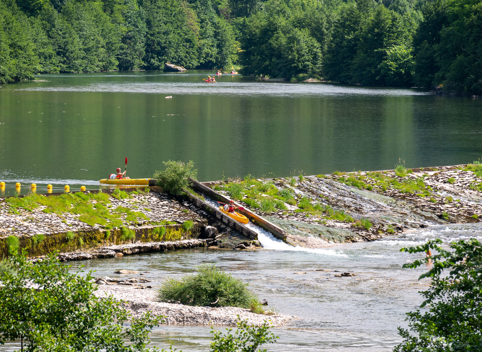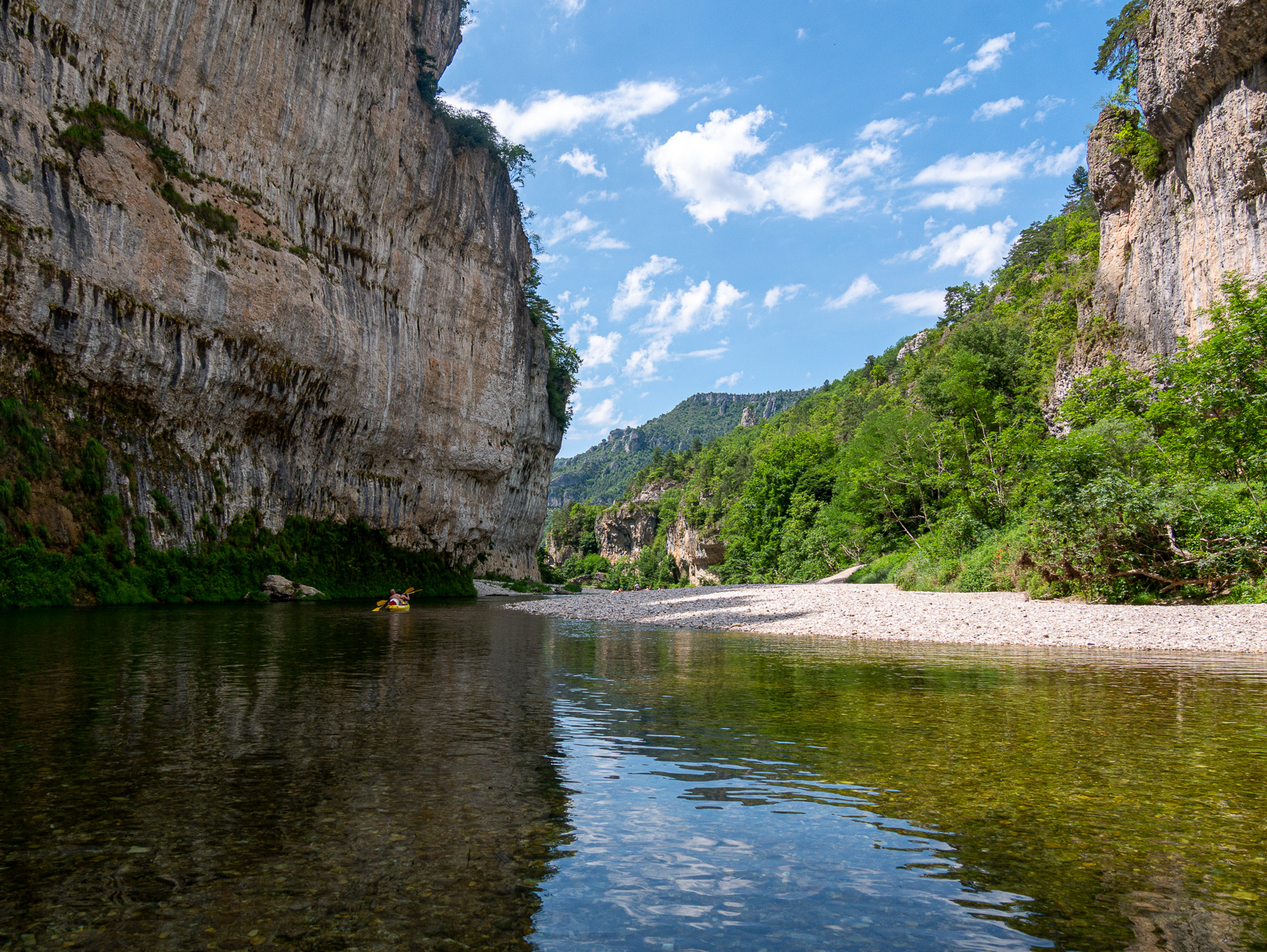 Und jetzt das Highlight. Wir mieten ein Boot mit Motor und Führer und schippern den Tarn durch die interessantesten Stellen, wo die Gorges bis zu 450 m hoch/tief sind und filmen und fotografieren. Für mich relativ einfach mit der Actioncam, aber Sara visiert immer neu die schönsten Motive an. Eine Stunde dürfen wir sitzen und staunen. Gar nicht so einfach für den Schiffer durch Flachwasser zu steuern und dabei erzählt er, dass letztes Jahr nach Schneeschmelze in den Bergen der Wasserstand bis 7 m höher war. Auf dem Fluss sind unheimlich viel paddelnde Kanus unterwegs, viel Badende und angeblich viel Fische, die wir nicht gesehen haben. Wir wurden mit Bus und Anhänger mit 3 Booten zur Einstiegsstelle zurück gebracht. Wir brauchten noch eine Zeit diese Eindrücke zu verarbeiten. Dabei half uns ein großes Eis.