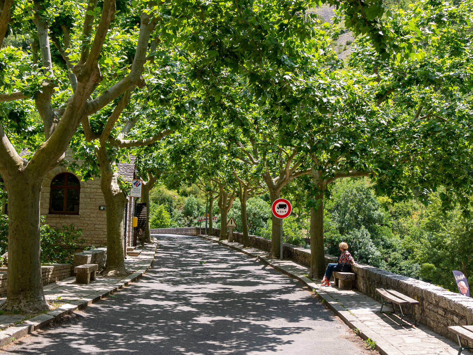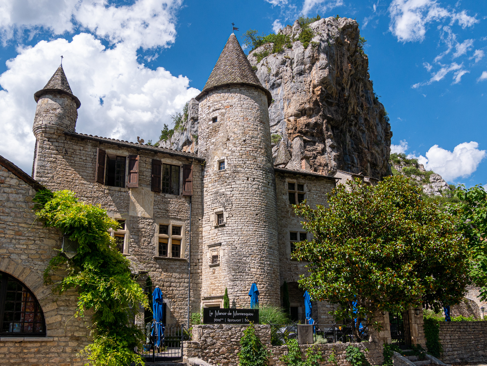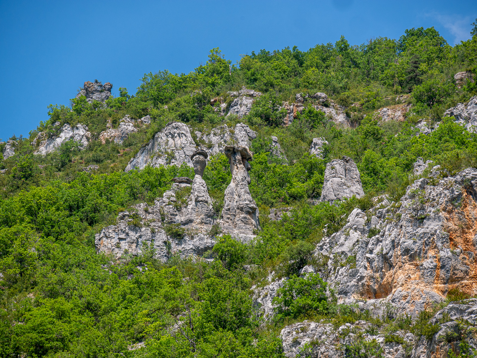 The next stop was La Malène, a village that is the departure point for many kayak and canoe rentals as well as what we had chosen, a guided riverboat tour. We wanted to look and take pictures and not worry about navigating a kayak. For us, it was the perfect choice. A young man (Thomas) was our guide and he explained the highpoints first in French (for the French couple) and then in English for us. We rode an hour down the narrowest part of the gorge, dramatic rock formations towering over us, occasionally dragging a hand in the cool, clear water. It was truly spectacular – you know how it is when you have read about a destination for years and when you arrive you are disappointed? This was the opposite – all of our expectations were exceeded.