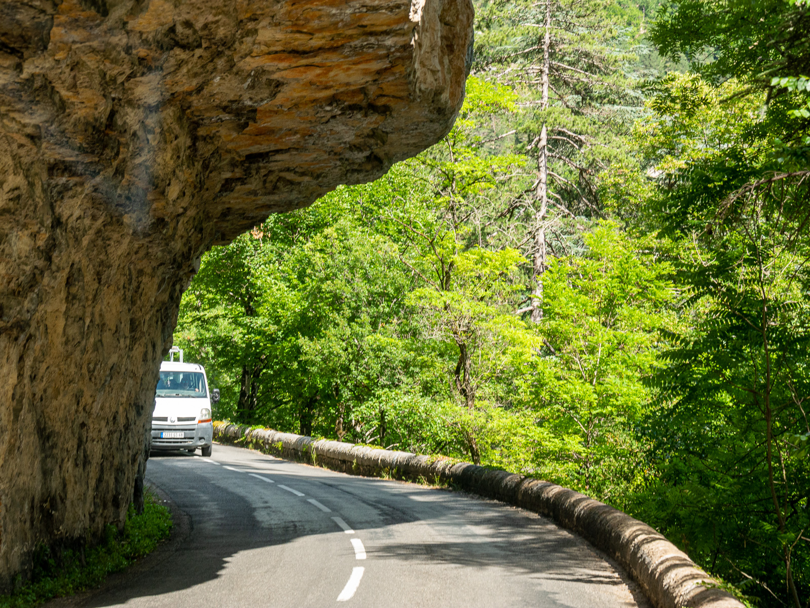 Noch beeindruckender und mächtiger, die Schluchten noch tiefer und enger. Die Felsen bizarr durch Wind- und Wassererosion. Und Steinbögen wie in den Arches in USA sehen wir. Nach 10 km kehren wir um, denn heute steht noch ein Highlight auf dem Programm. Wir fahren zum WoMo, packen fertig, laden die Räder auf (für Iris, ich meist allein und ohne Leiter) entleeren, befüllen, nun schon Routine, und fahren los den Tarn entlang bis La Malène.