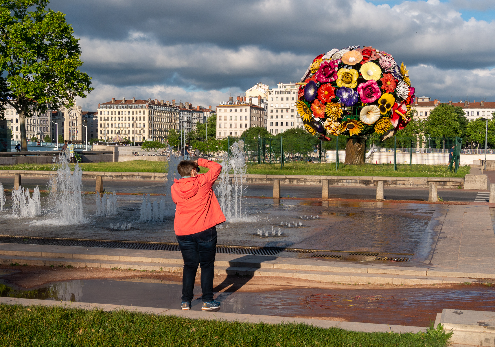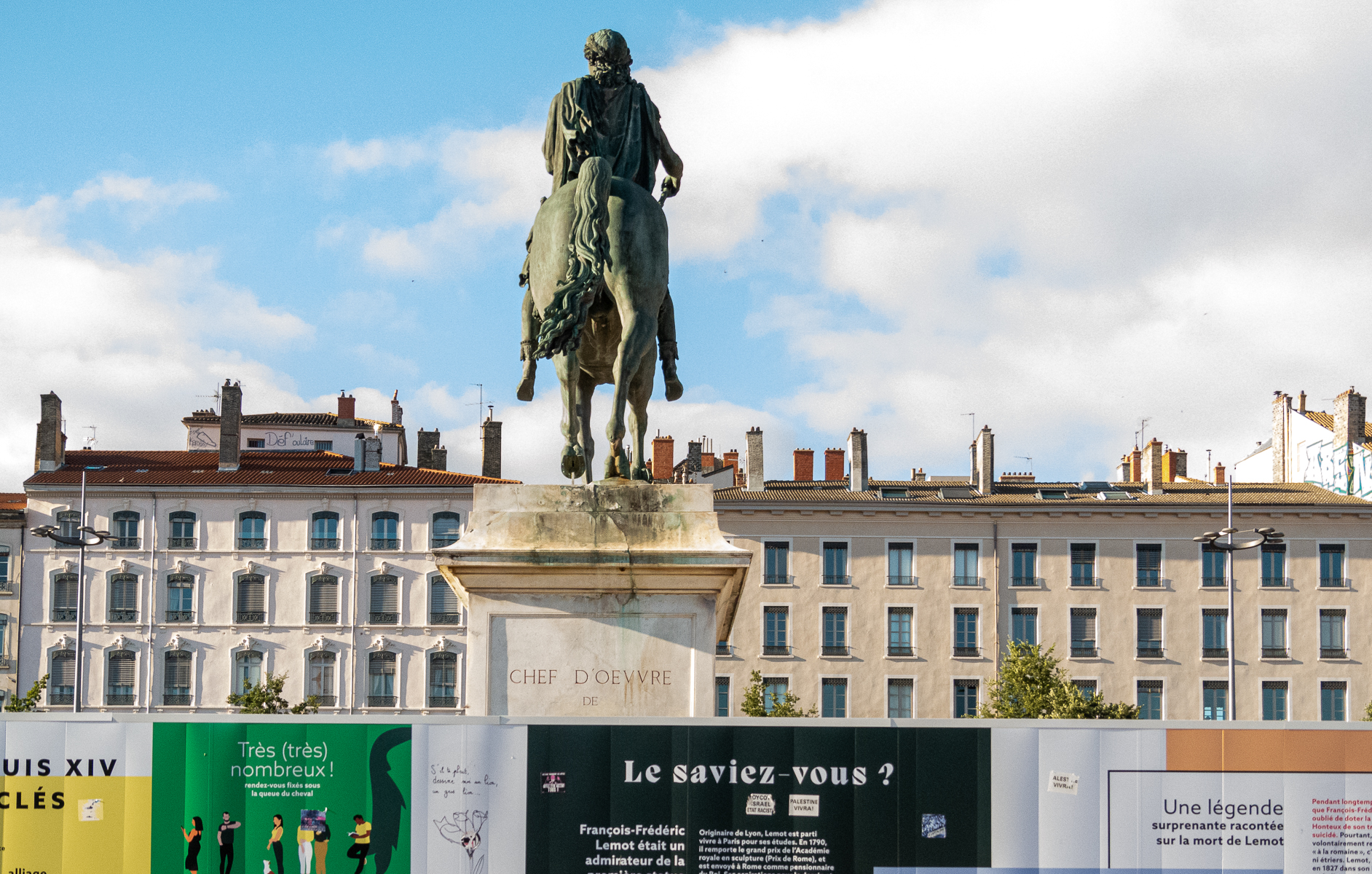 Ausstieg am Bellcourplatz, dem größten Stadtplatz in Europa (roter Sand), mit Reiterstandbild Louis XIV, beeindruckend die schönen großen Häuser ringsherum und vor allem der freie Blick auf die Fourvière, eine weiße Wahnsinnskirche auf dem Berg.