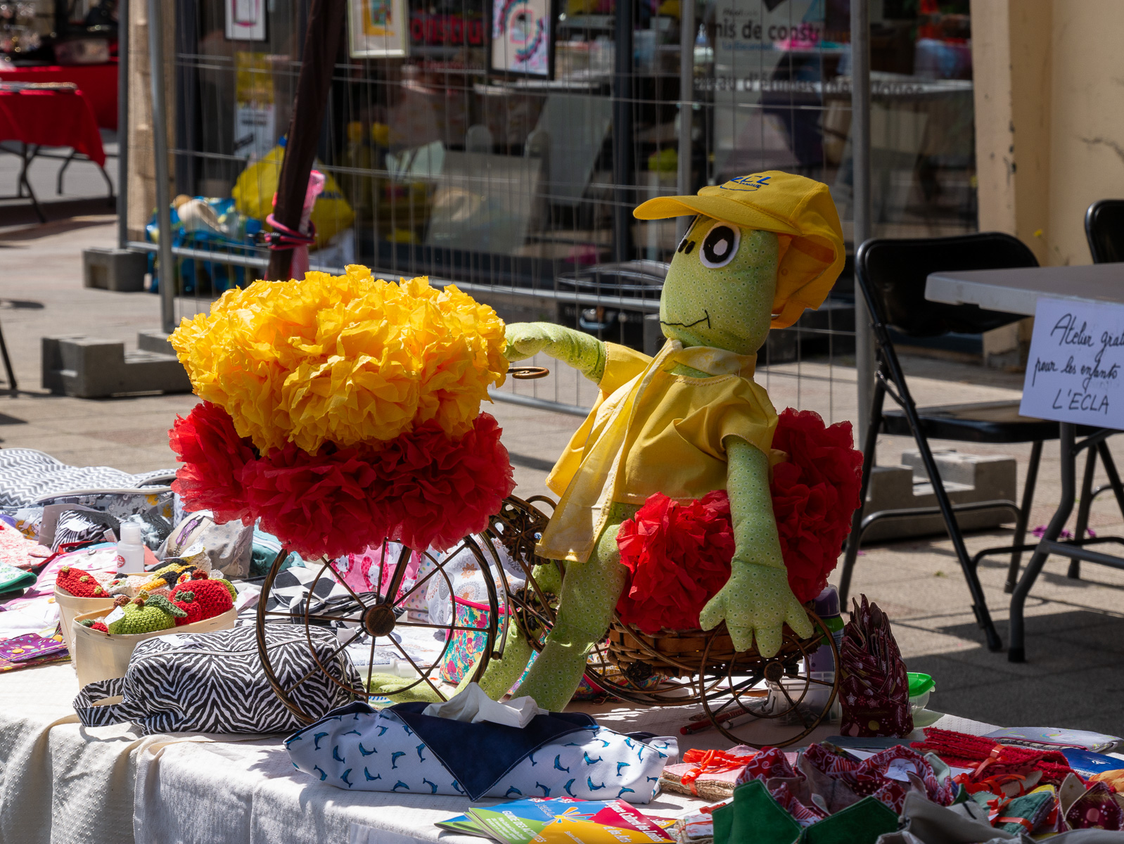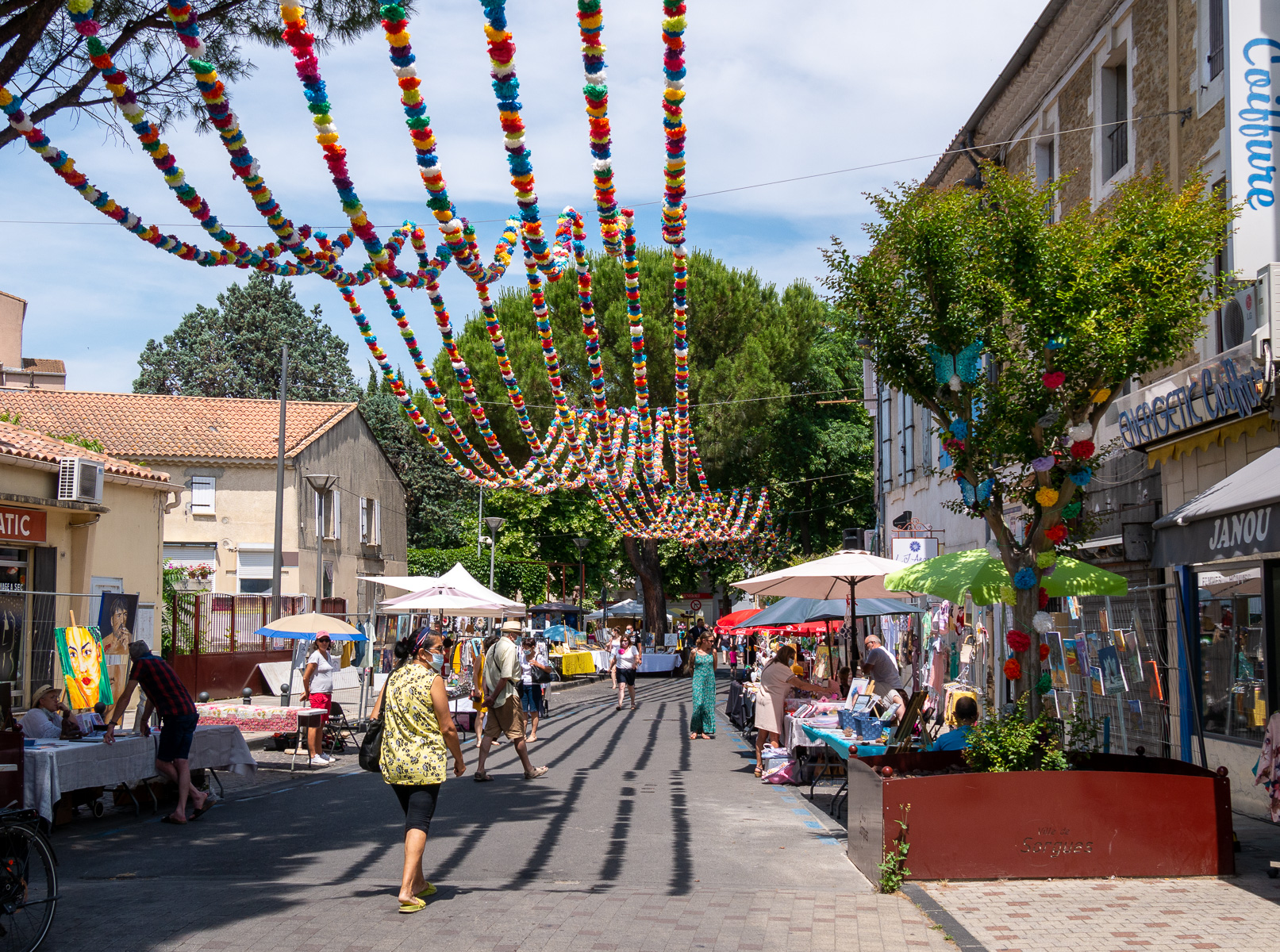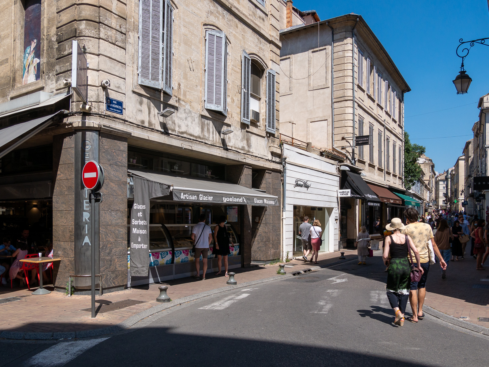 Much to our delight, as we got into the town of Sorgues, 5km down the road, the center of town had been closed off for a town festival/flea market with a “Tour de France” theme. (This is where they colored the fountain yellow.) We masked up and pushed our bikes through and had smiles on our faces for the rest of the hot ride into Avignon. We put a particular curse on the person who installed a thousand stanchions along the otherwise pleasant canal bike path that leads into central Avignon. For 5km, just about every 300-500 meters, we had to either step down and straddle our bike through or wend our way very slowly through the stanchions. Ugh.