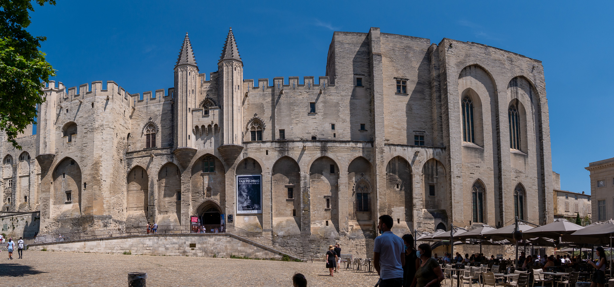Plötzlich standen wir vor der Stadtmauer (diese ist sehr gut erhalten und lang). Wir fanden ein offenes Tor in die Altstadt und auf dem Platz Pie mit der Markthalle. Leider zu spät, wir konnten nur noch schnell 2 Flaschen Wein kaufen, dann sperrten sie hinter uns ab. Wir aßen eine kleine Brotzeit und tranken Wasser. Dann mit Rad weiter und standen gleich vor dem Papstpalast. Foto, Foto, Foto wie Tausende Touristen und Video von diesem Platz. Fast ehrfürchtig steht man vor der Größe. Ich hatte den Eindruck, die mussten sich verteidigen oder hatten was zu verbergen. Wir gingen nicht rein, denn in der franz. Revolution soll sehr viel geraubt worden sein oder konfisziert.