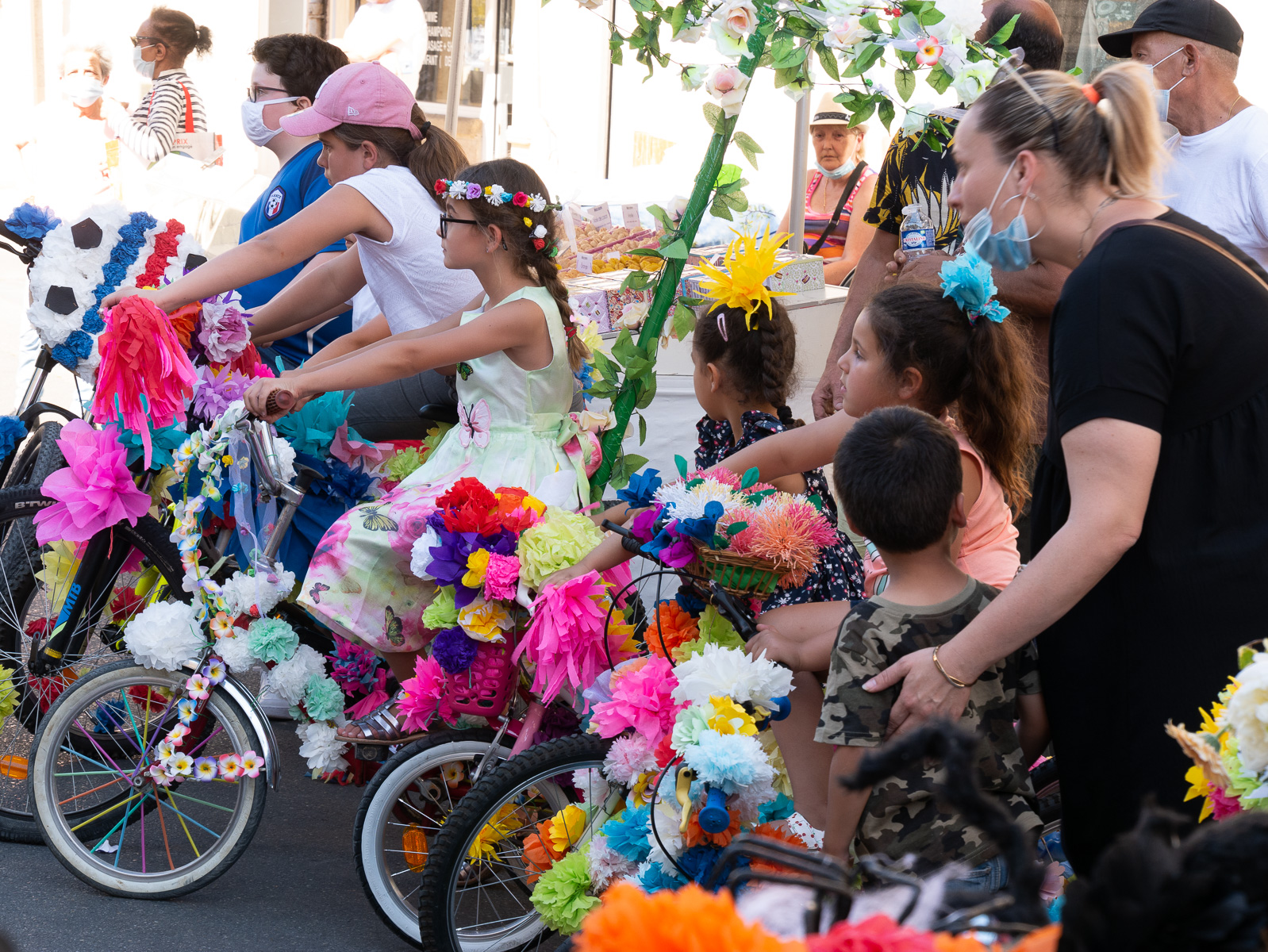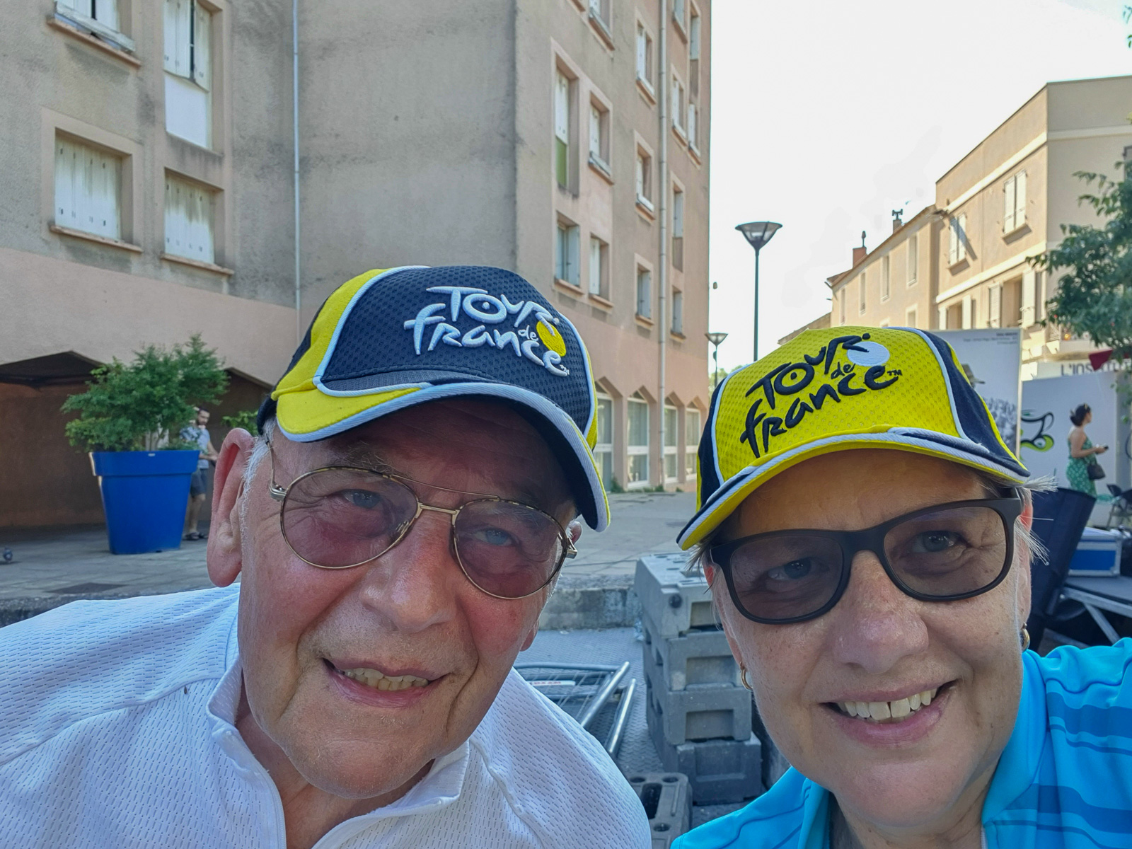 On the way back to camp we pulled into Sorgues just in time for the “decorated bicycle parade” part of the day’s festivities. It was so sweet! And as we rode along behind the entrants, we got a couple of encouraging cheers from the sidelines. We celebrated our parade debut by quenching our thirst with a beer and buying “official” Tour de France baseball caps. I plan to wear mine as I watch the Tour on tv this year.