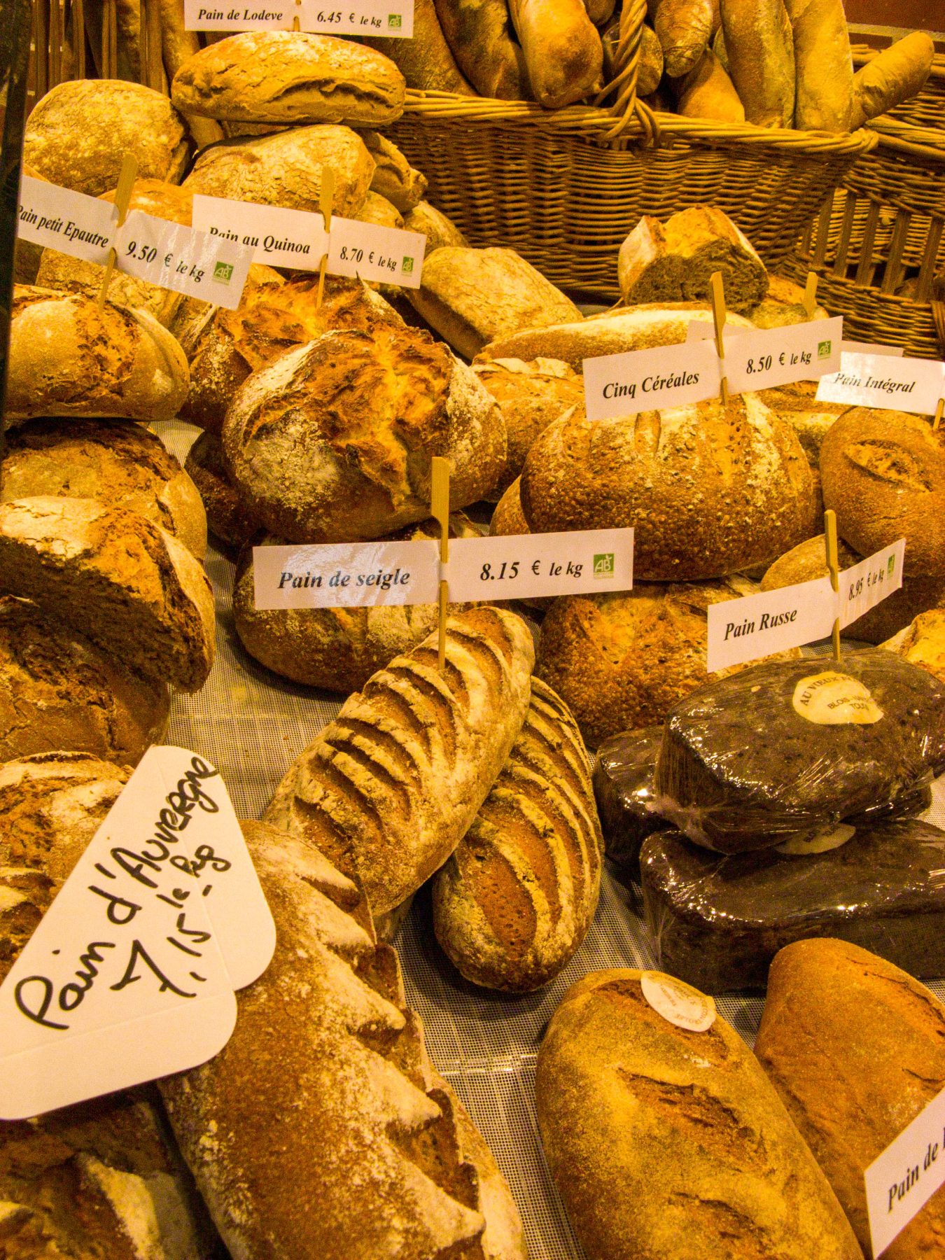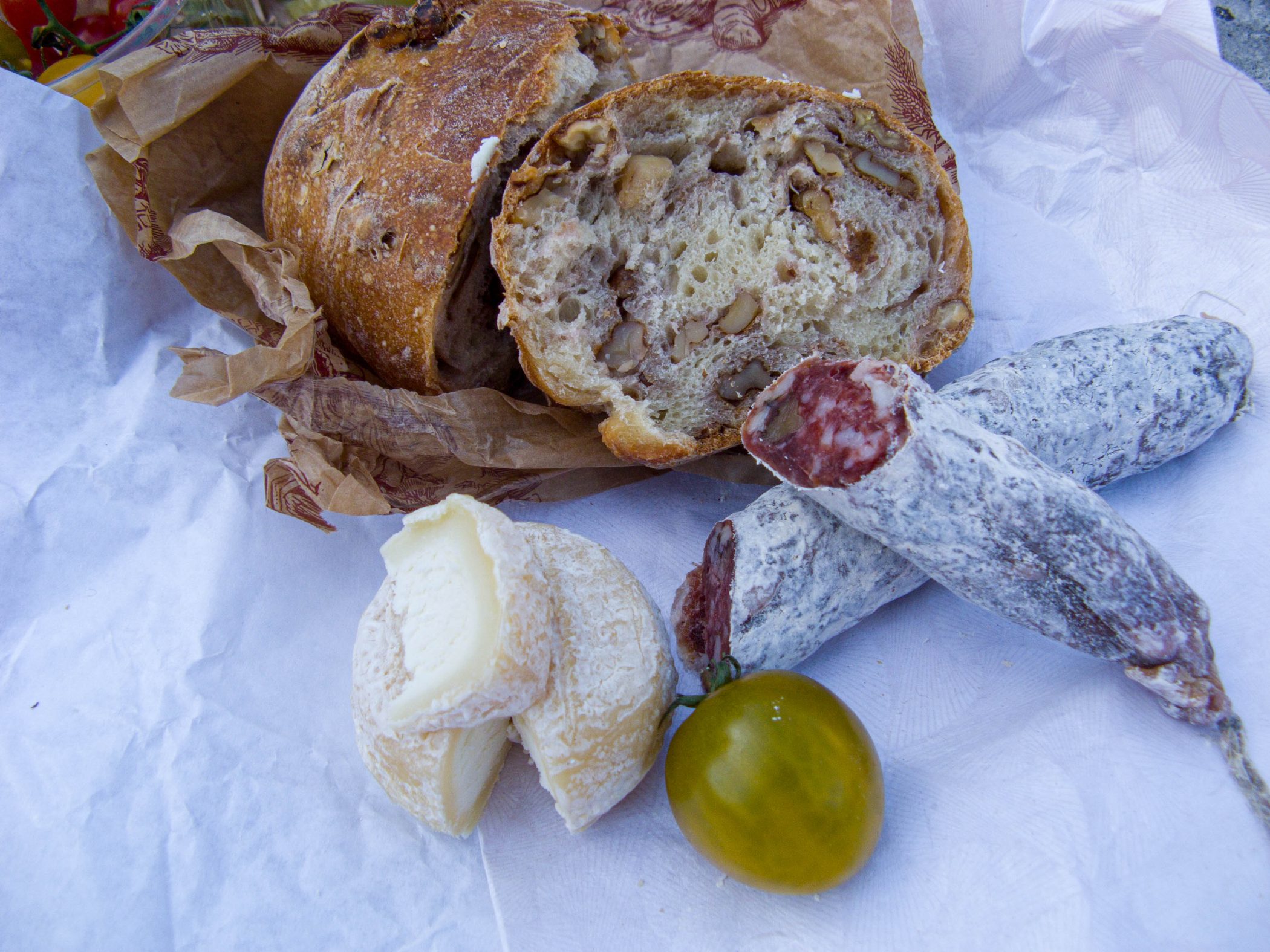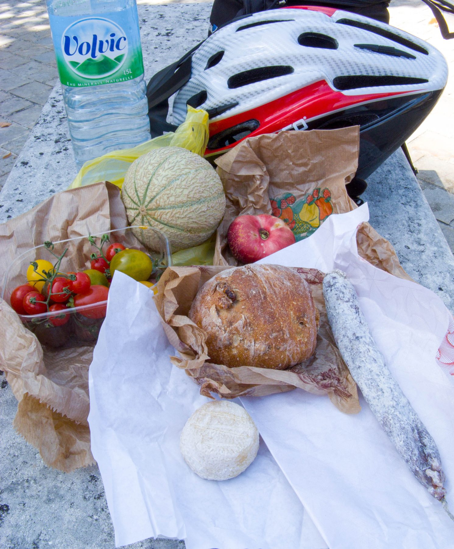 The next stop was les Halles, the food market. The outdoor farmers’ market was in full force when I got there, tables piled with beautiful produce, fresh eggs, local wines—it was very difficult not to buy one of everything, so I took lots of pictures and settled for buying a cantaloupe. Then it was on to the indoor portion of the market, the “deli” area. Oh my God! There were also a few fruit/vegetable stands but mostly the large hall was filled with cheese vendors, butchers, bakeries, fish markets, deli-stands with olives and prepared foods. It was almost (note that I say “almost”) sensory overload. My, oh, my. I composed a picnic fit for the Gods.