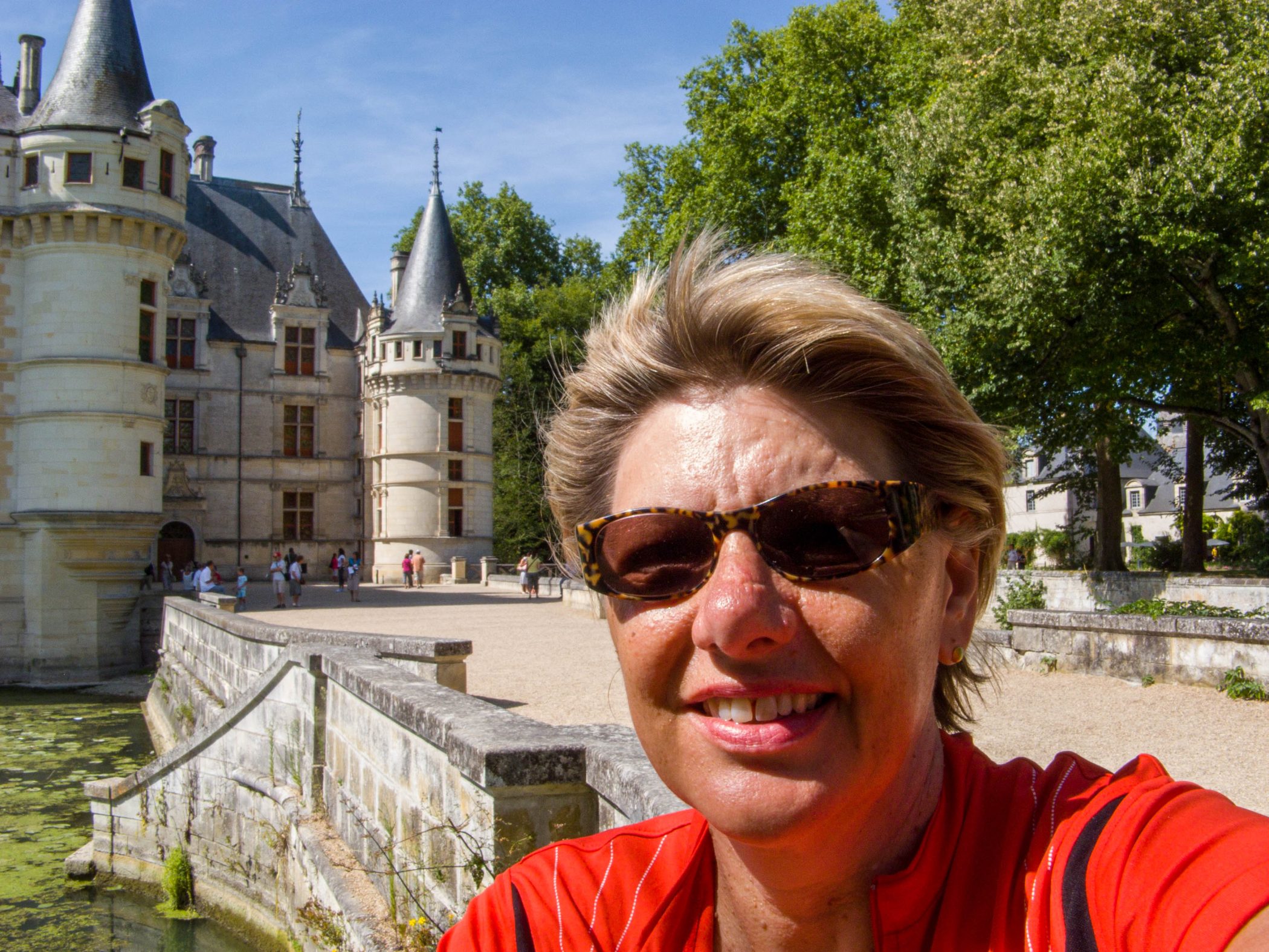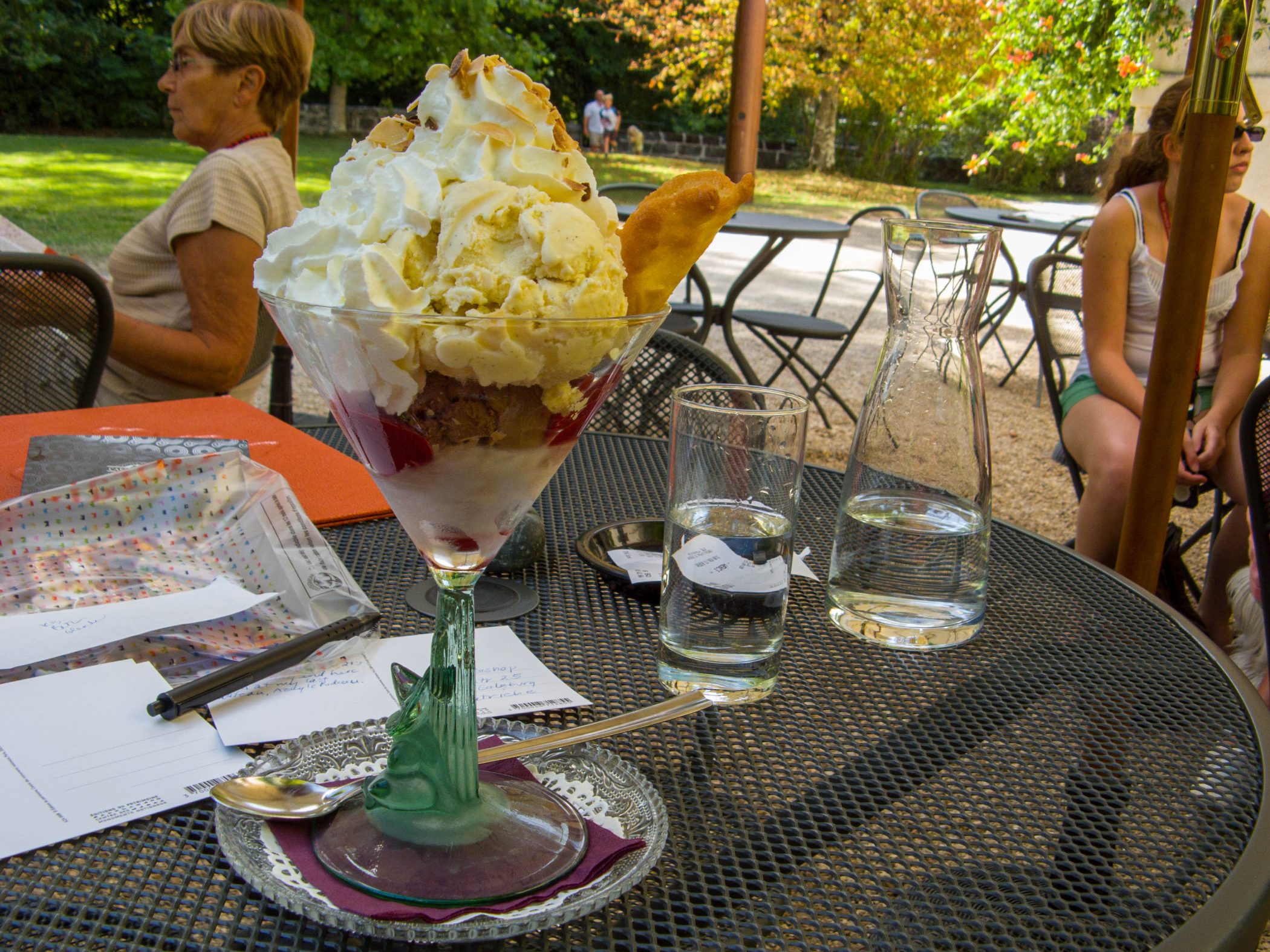 The following 18km were some of the slowest I’d ridden (1hr 20min) but they were totally lovely. The first stretch was on a levee along the Loire, with the river on the left and sweeping fields to the right. The next section went away from the Loire through farmlands and a forest of uniformly planted birch trees with wonderful light streaming through the branches. The last stretch went right along the river Indre into Azay-le-rideau. I paid the admission price to get into the grounds and stroll around but didn’t go into the chateau itself—I just wasn’t into crowds. So I celebrated my last chateau visit of the week with an ice cream creation enjoyed on the terrace facing the chateau.