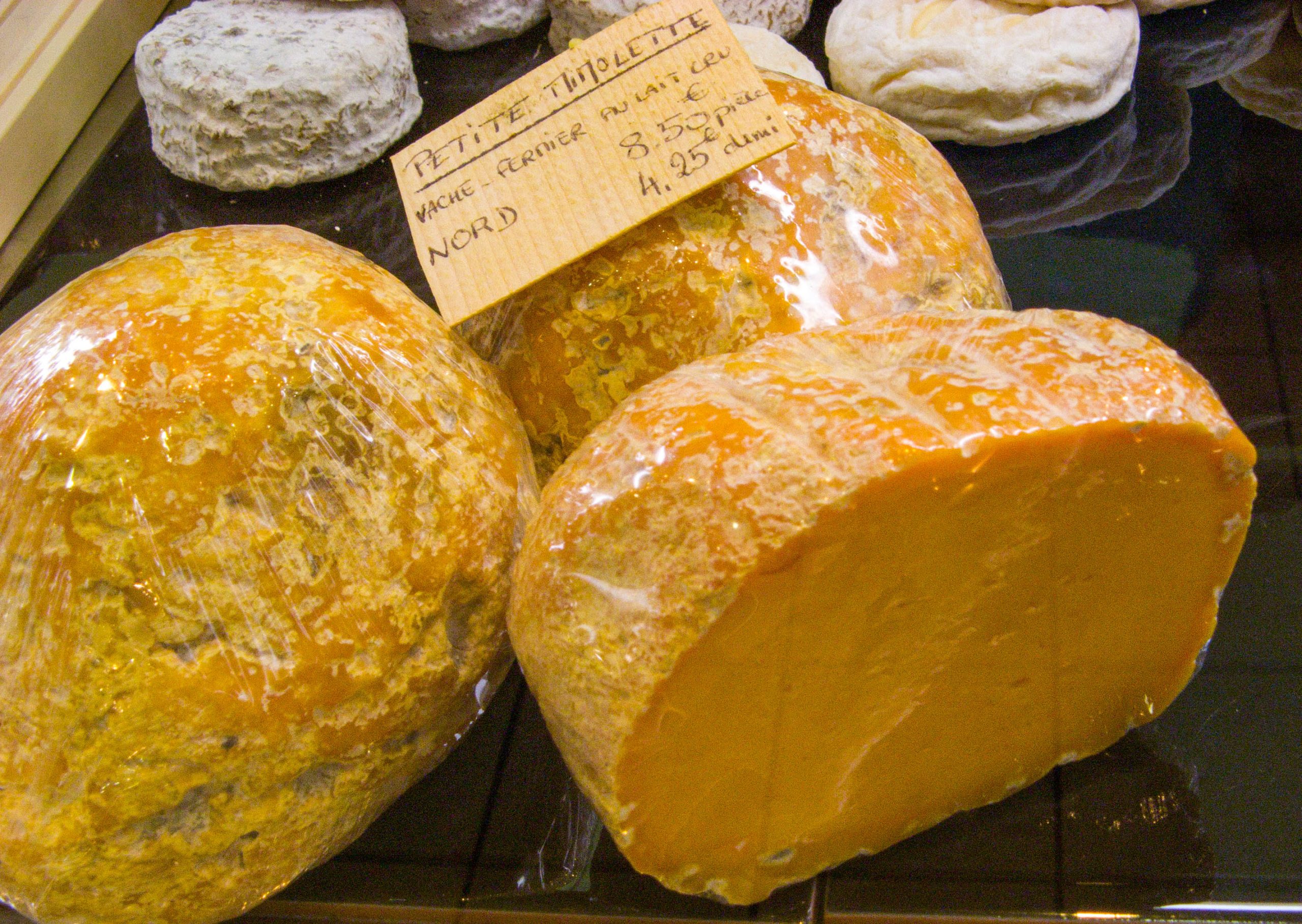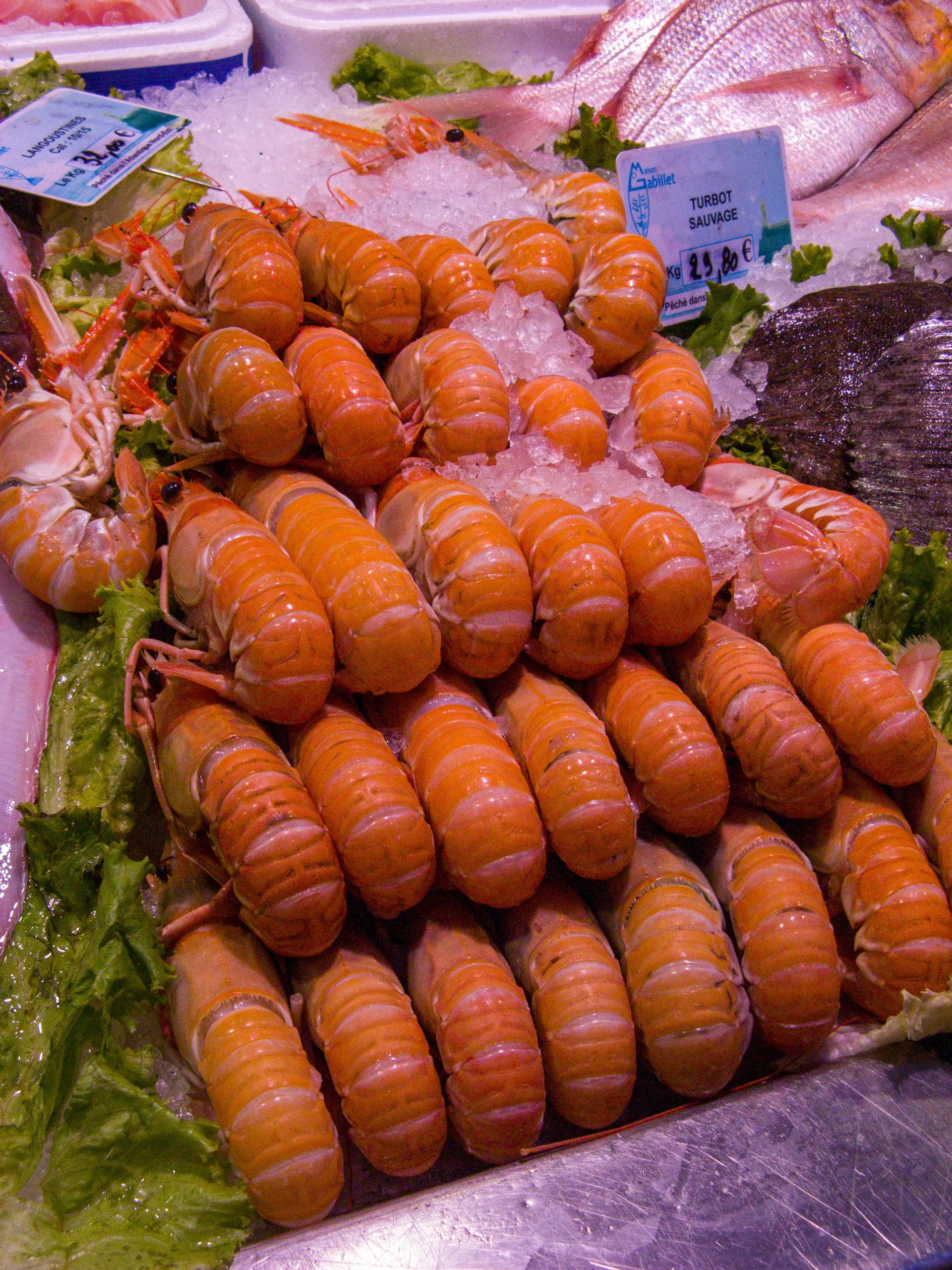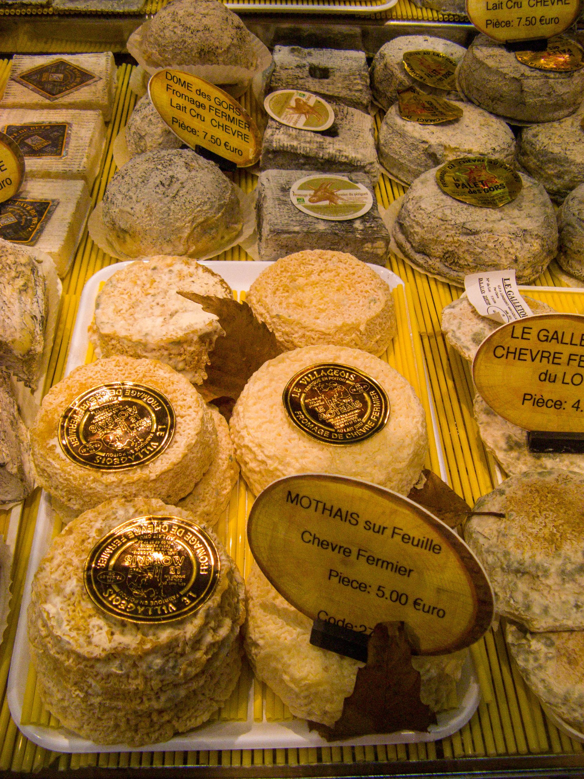 The next stop was les Halles, the food market. The outdoor farmers’ market was in full force when I got there, tables piled with beautiful produce, fresh eggs, local wines—it was very difficult not to buy one of everything, so I took lots of pictures and settled for buying a cantaloupe. Then it was on to the indoor portion of the market, the “deli” area. Oh my God! There were also a few fruit/vegetable stands but mostly the large hall was filled with cheese vendors, butchers, bakeries, fish markets, deli-stands with olives and prepared foods. It was almost (note that I say “almost”) sensory overload. My, oh, my. I composed a picnic fit for the Gods.