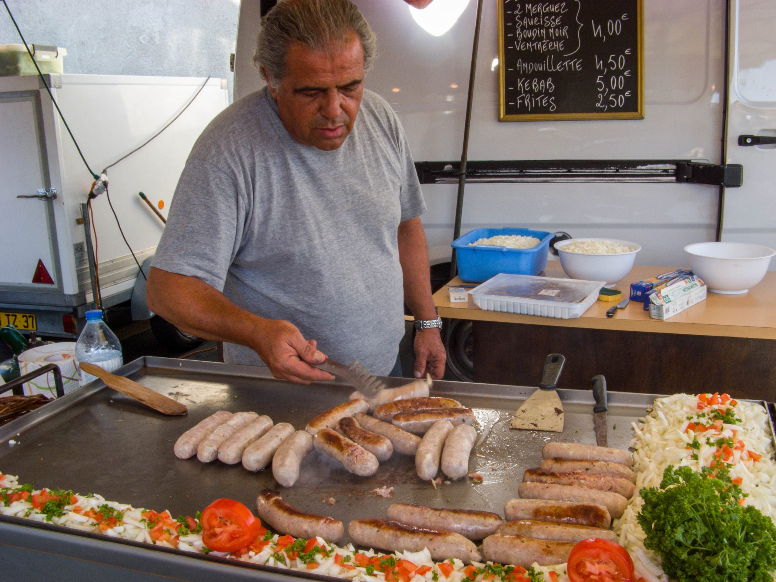 As I arrived back in Langeais, I saw to my delight that a “Broquant” was being set up; a street fair with artisan booths (as well as tacky stuff) and (my favorite, of course) lots of stands featuring grilled locally-produced meats. Believe it or not, I didn’t actually eat anything, just photographed the grilling, and strolled around until it was time to catch the train back into Tours.