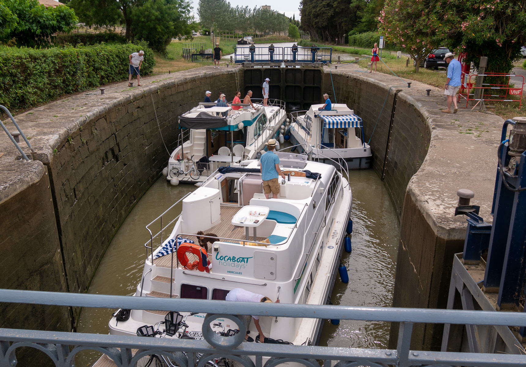 Undweils ausnahmsweise schön war radelten wir gute 10 km am Canal entlang die Strecke die Sara mit Vera 2011 gefahren war, schauten dem Schleusenbetrieb zu (bis 3 Schiffe gehen in eine Kammer) winkten ab und an den Vorbeifahrenden zu, insbesondere wenn ich deutsche Laute hörte. Zu Rad ist man selbst auf schlechtem Weg viel schneller als die Schiffe. Auf dem Rückweg sang ich mir den Fahr- und Wetterfrust aus der Seele bis meine Stimmbänder versagten.