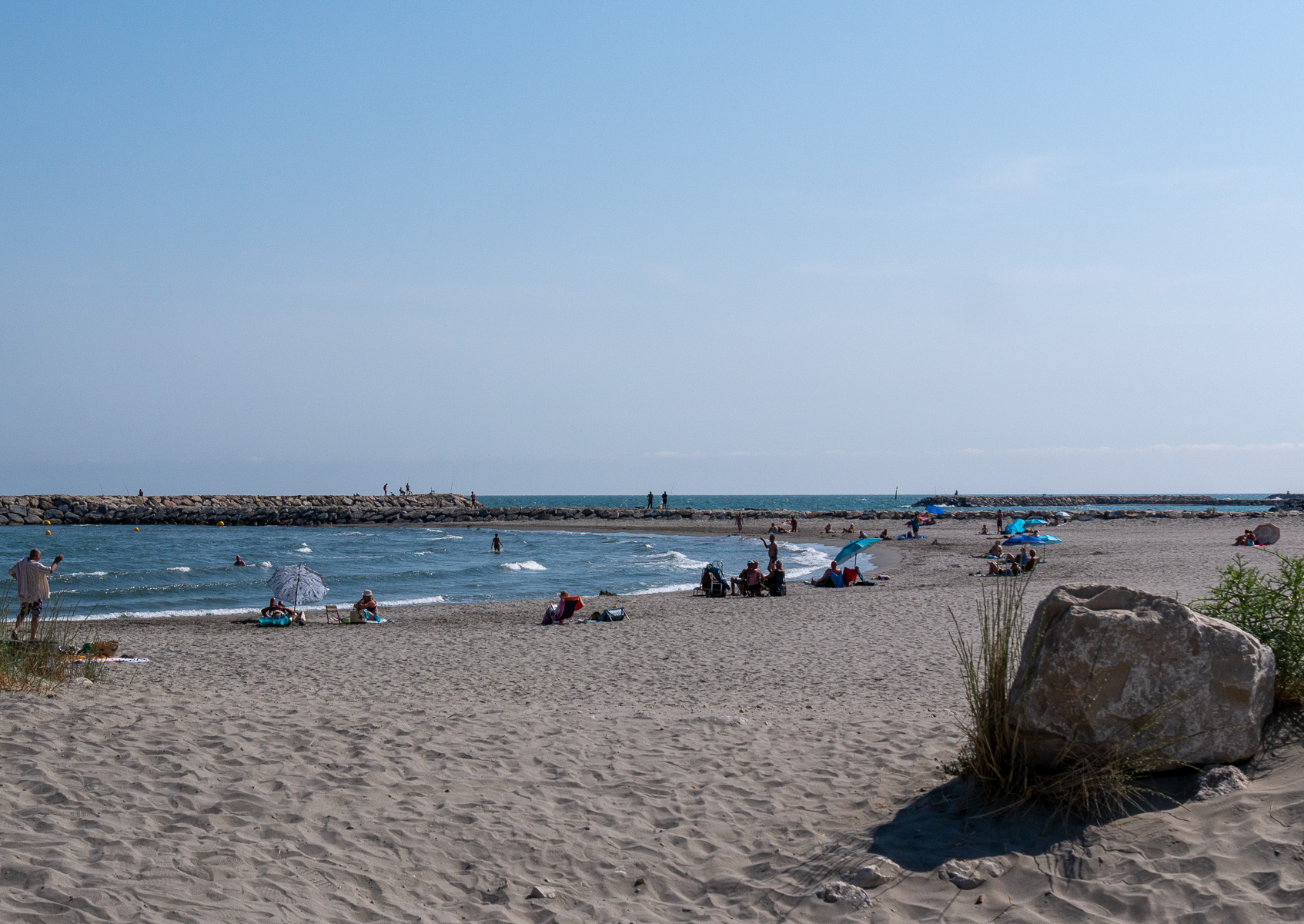Hineingefahren in das Dorf, das ich mir anders vorgestellt hatte, und das ich nur als Feriensiedlung empfand. Auch die „Zigeuner“ die dort feiern sollen, waren entweder wegen Covid nicht da oder schon wieder weg. Wir fuhren also weiter zum Camingplatz La Brise de Camargue. Wir fanden einen schattigen Platz unter einem großen Olivenbaum. Sehr schöne Anlage mi einem tollen, supermodernen Pool und super Duschen ua. Wir bekamen das berühmte Allinclusive Band ans Handgelenk, Kennzeichen registriert und Karte um zum Strand zu kommen (4* hat das). Noch wars heiss und ich mit Handywetter nicht so vertraut, hoffte auf nächsten Tag. Wir gingen noch in die Stadt, schlenderten vorbei an den gefüllten Parkplätzen der Tagbader. Seit Frühstück nichts gegessen und es war schon 17:30 Uhr und Sara hatte sehr lange Zähne und aß in kleiner Kneipe Falafel. Ich hatte keinen Hunger wegen meiner Medizin nur Durst den ganzen Tag.