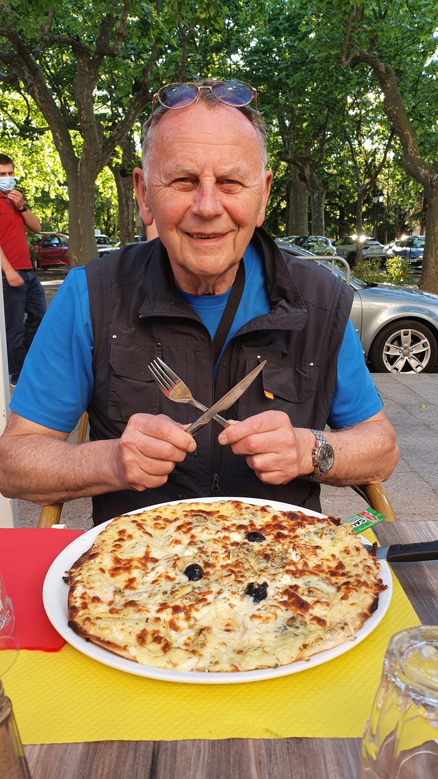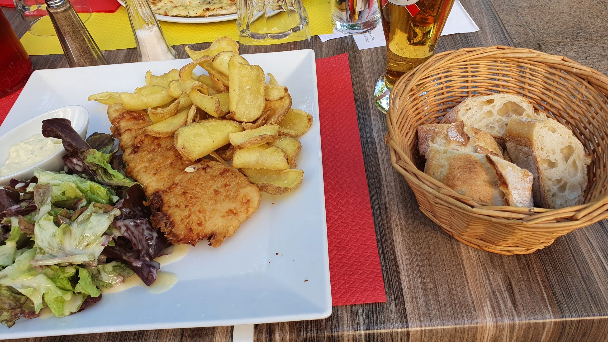 Ganz anderes Bild in der (Restaurant)Hauptstraße, alles voll. 1. Lokal Essen ausverkauft. Ganz schüchtern gefragt beim Nachbarn u von freundlicher Maid. Table reserve bekommen. Kind u Kegel alle Rassen vereint bei der Fütterung. Großes (rat mal für wen) und kleines Bier im Voraus, dann Order für Pizza blanche 4Formaggi und fish & chips. Schlecker lecker, dann Eis Caramel mit fleur de sel u Nougat ( Montelimar ist die Weltstadt für Nougat) und ein Espresso. Wir gingen 20:15 Uhr und es sah nicht so aus, dass alle im Aufbruch wären um um 21 Uhr ( lt. PandemieVO) zu Hause zu sein. Vllt ist es dort auch erlaubt mit knapp 100 kmh mit Motorrad innerstädtisch zu fahren.