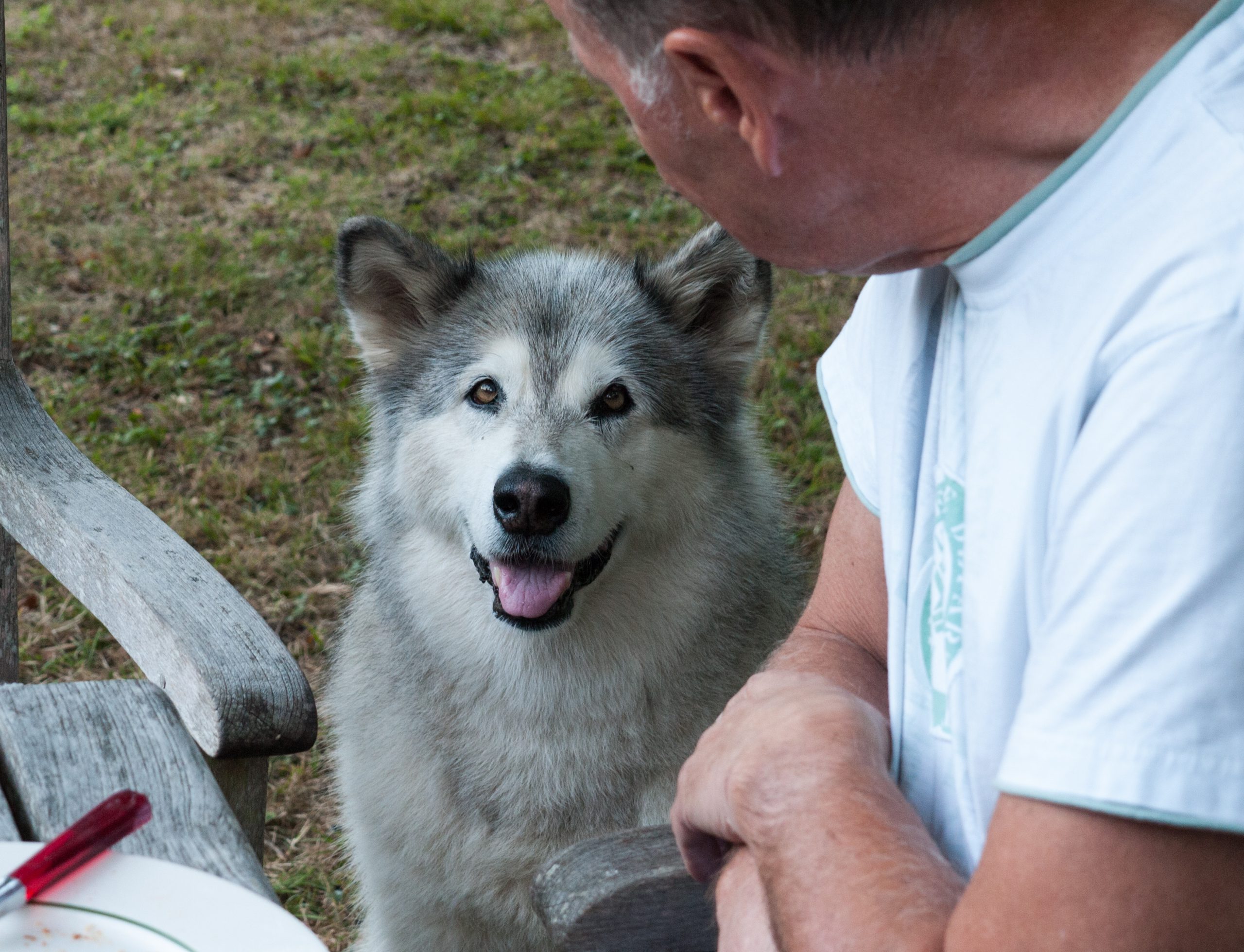 After a swim to wash away the heat, we gathered our picnic things together and made our way to “our” table in the garden. Very soon thereafter we had canine company – the resident Husky smelled the paté and was by us in a flash. Werner was a real softie and kept giving him treats so he stayed by us for quite some time.