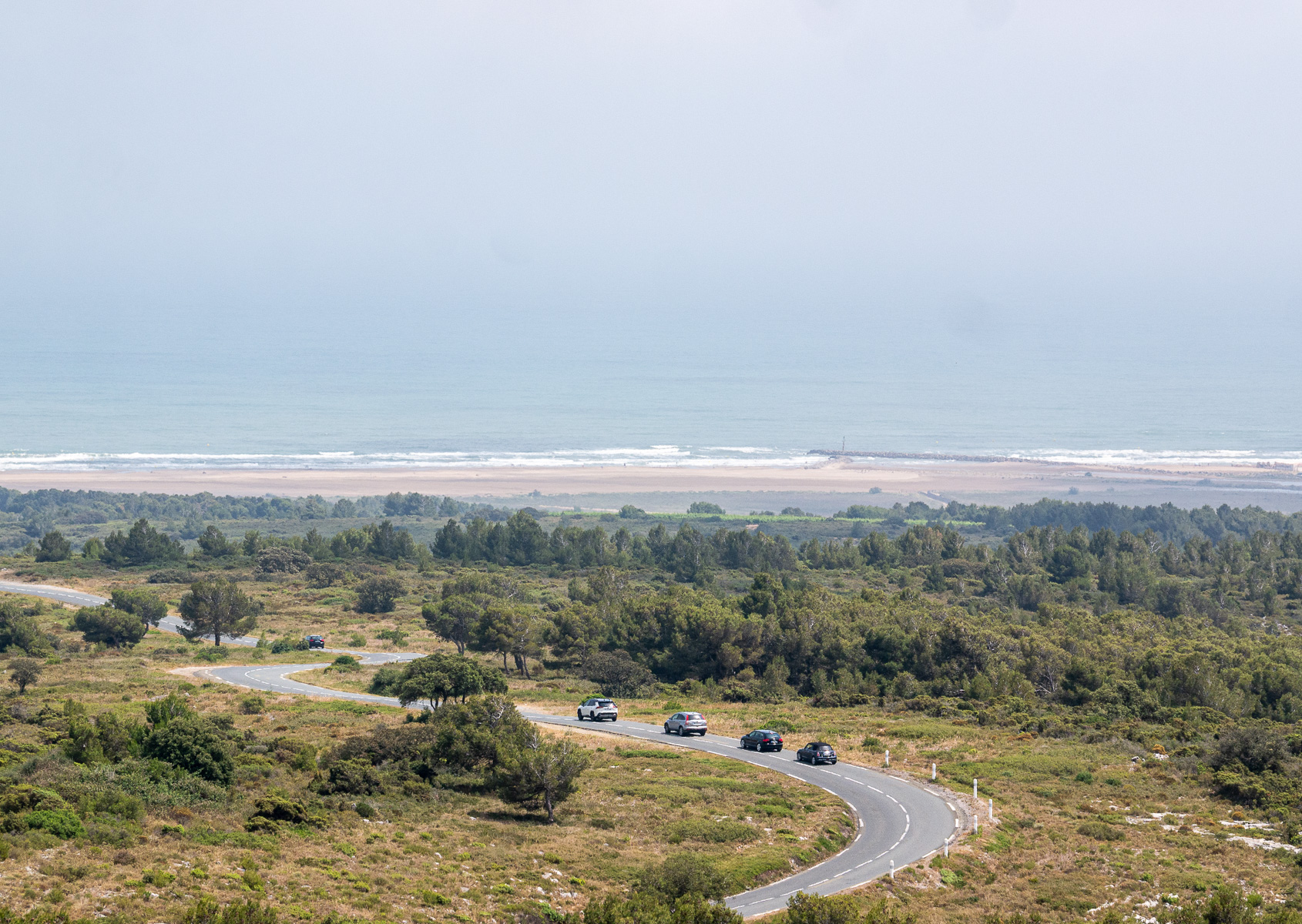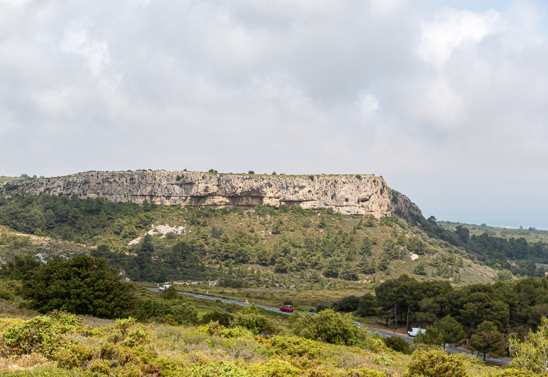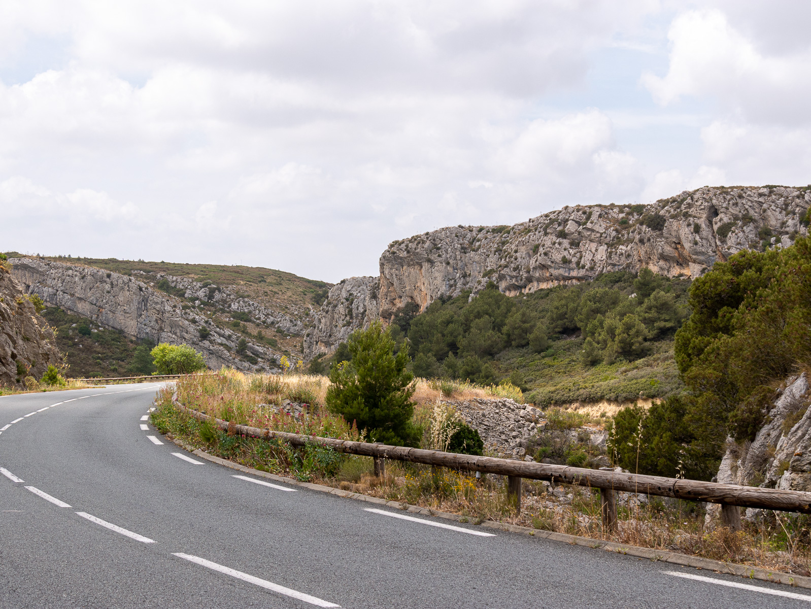Richtung Narbonne auf der Autobahn, so konzentriert musste ich schon lang nichtmehr fahren, die LKw lieferten sich ein Wrestling, zogen einfach raus, und es waren viele, dazwischen Windboen, wenn die Seite frei war. Diese 74 km hatten es in sich. Dann letzte Ausfahrt vor Narbonne raus Richtung N. Plage. Wir fuhren in eine Juralandschaft, tolle Felsformationen, Serpentinen, Windfügel am Kamm, Radarstationen und plötzlich ein Ausichtspunkt. Ich tippe auf Flugabwehrbunker aus Weltkrieg II mit super Ausblick.