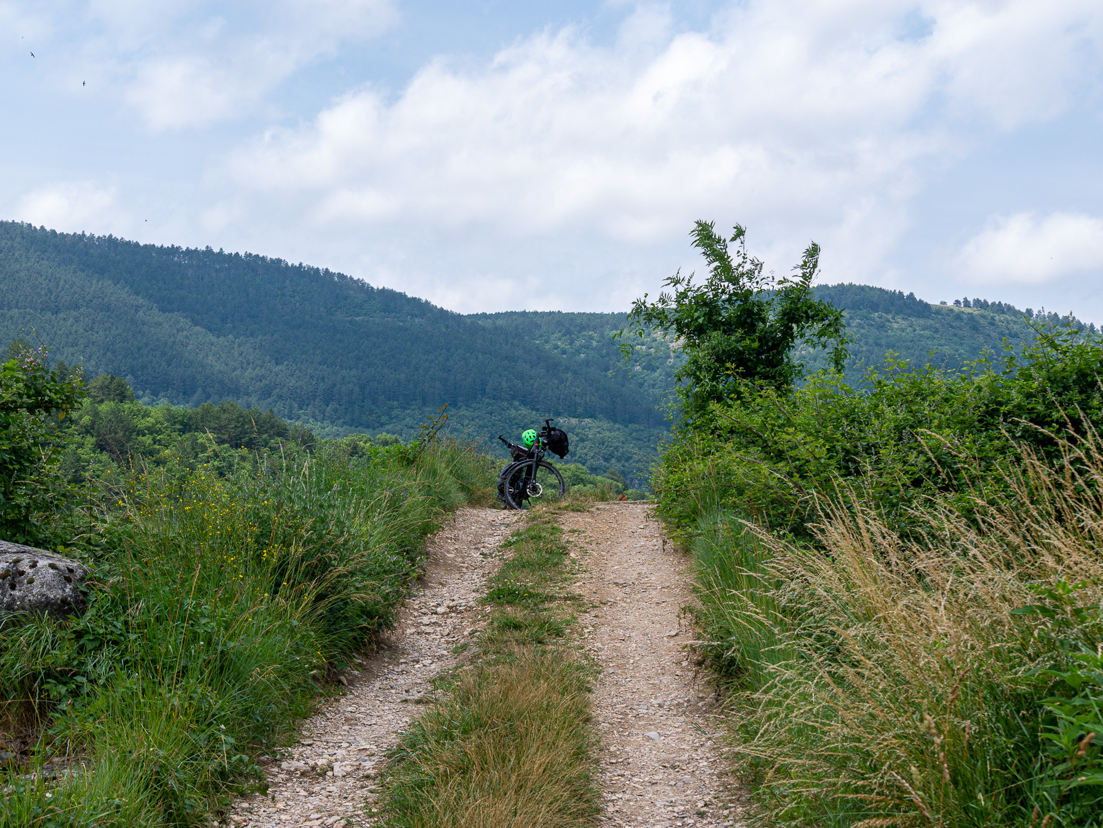 Werner spotted a route heading uphill (always a temptation for him, less for me…) and goaded me into riding up with him. It was a lovely detour – up unto grassy fields with a couple of stone huts, and a herd of sheep taking shelter under trees.