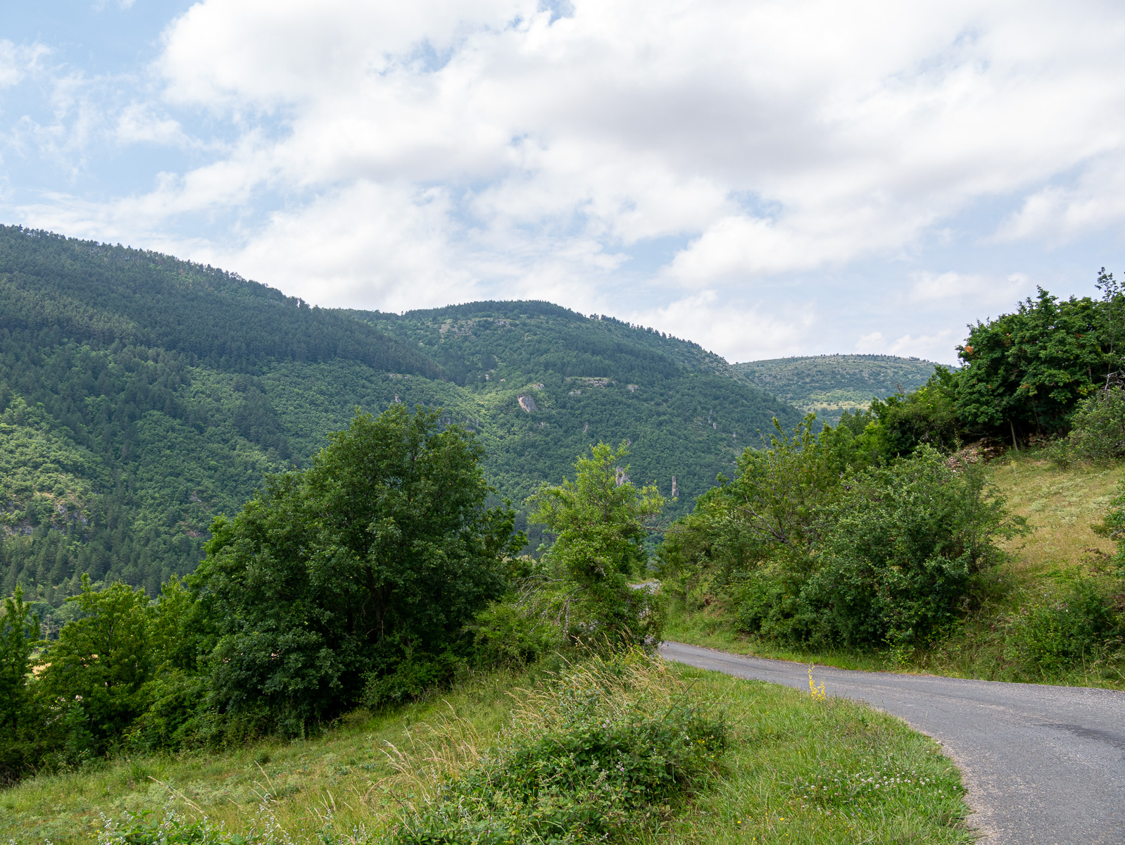 It was grey, windy and threatening to rain as we took off, so we both donned our rain jackets. As we rounded the first curve around a cliff face in the direction of Florac, the wind hit us so strong I nearly stood still.