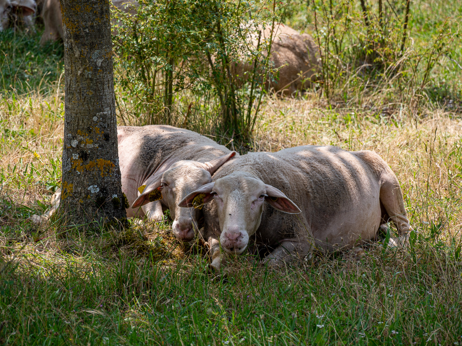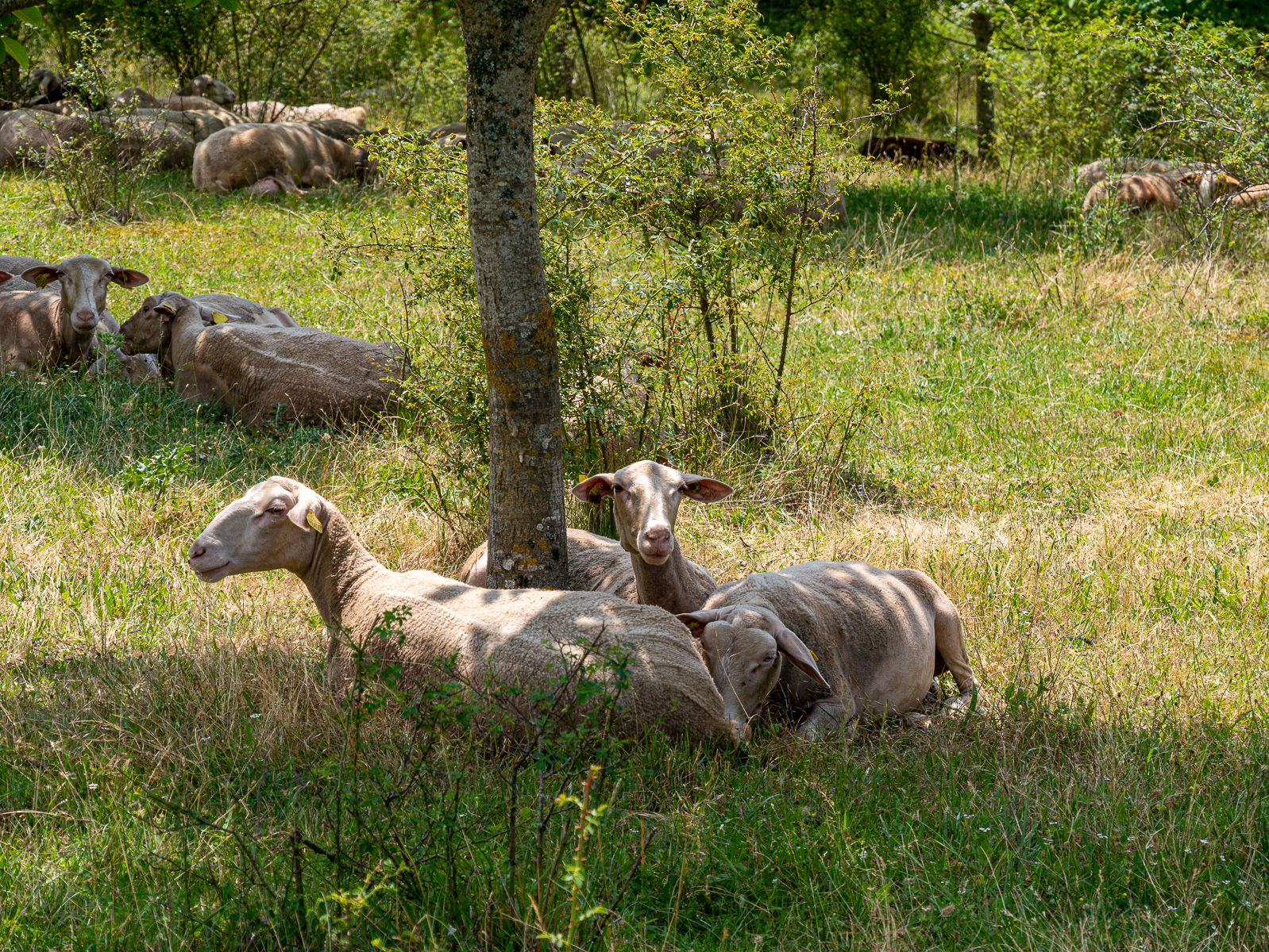 Beim Platz fuhren wir dann auf Feldweg zum Fluss, dann zurück die andere Seite und da war eine mittelalterliche Steinbrücke wie ein Hügel. Nach der Brücke bogen wir nach links auf ein kleines geteertes Sträßchen ein, das zügig bergaufwärts führte. Das braune Schild wies den Weg in Naturpark der Cevennen. Und es ging weiter bergwärts. Inzwischen traute sich die Sonne heraus. Bei einem kurzen Verschnaufer hörten wir Glöckchen und kurz danach auf einer Weide eine Schafherde bei ihrer Siesta (bei Schafen Wiederkäuertour).