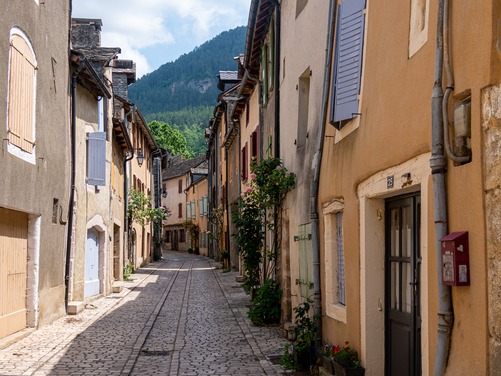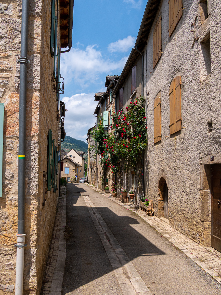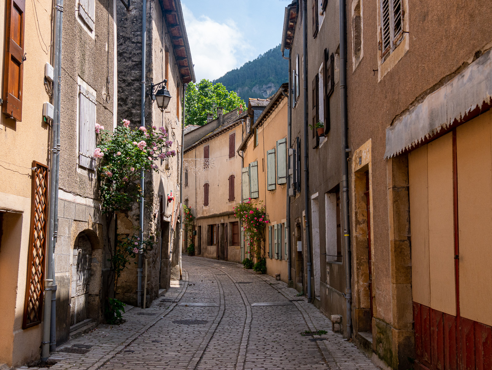 Noch ein Stück aufwärts gabelte sich der Weg, links steil weiter aufwärts, rechts runter. Da wir die Bergstiefel vergessen hatten, entschieden wir uns für rechts. Urige, kurvige, kleine geteerte Straße vorbei an Bauerhäusern und entlang einer „Rue de source minerale“ zurück zum Campingplatz. Sara wollte noch Blumen im Ort fotografieren, ich schwankte zwischen schwimmen und aufräumen., nach Blick Letzteres. IMMER noch kein Netz. Ich hatte in Florac mal kurz Infos abgesetzt, die wohl von dort später gesendet wurden.