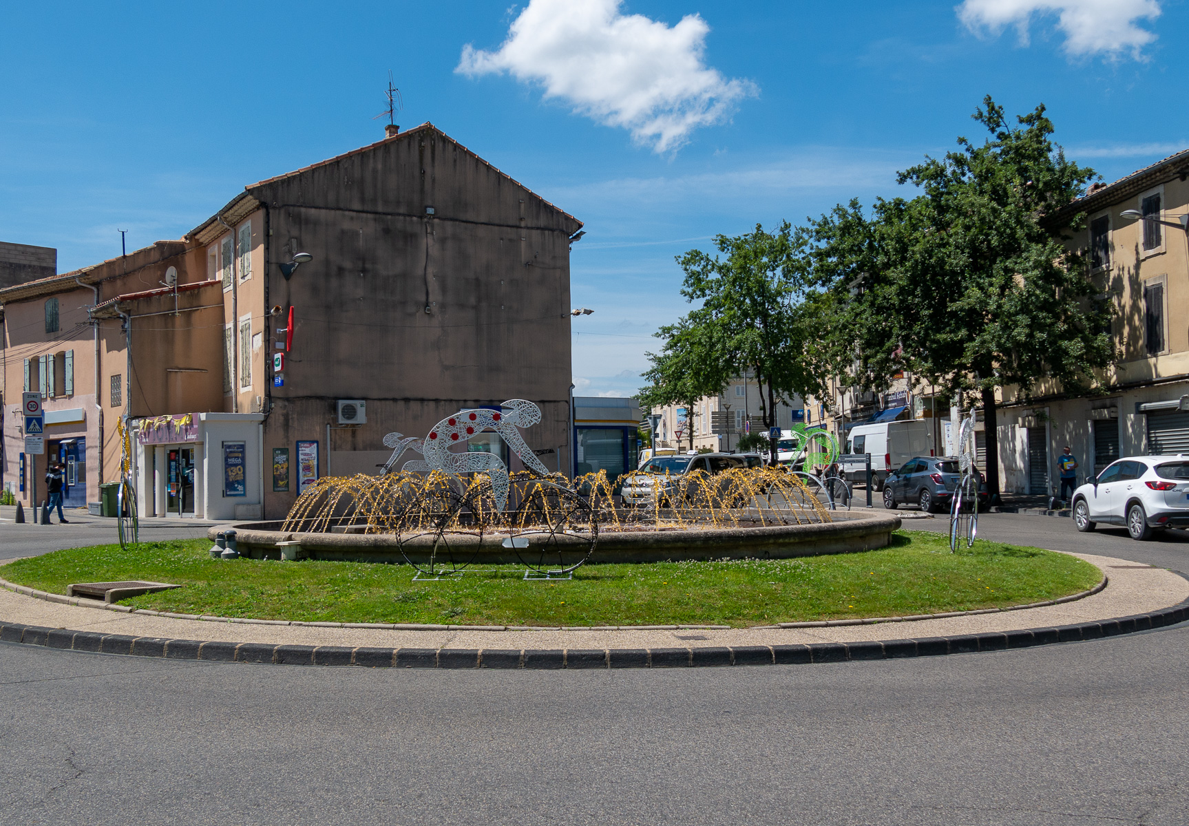 Our circuit first took us south towards the town of Sorgues, which is going to be a starting point for one of this year’s Tour de France stages. In honor of the fact, the town decorated the fountain in the spirit of the Tour and colored the water yellow (like the winning rider’s jersey). A definite picture stop for us Tour fans. Since it was lunchtime, we picked up sandwiches and found a lovely city park where we could enjoy the wildlife in the large pond as we ate.