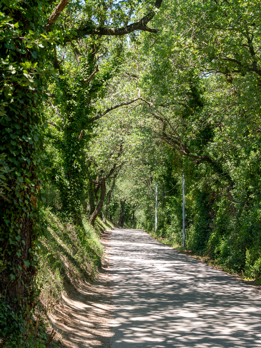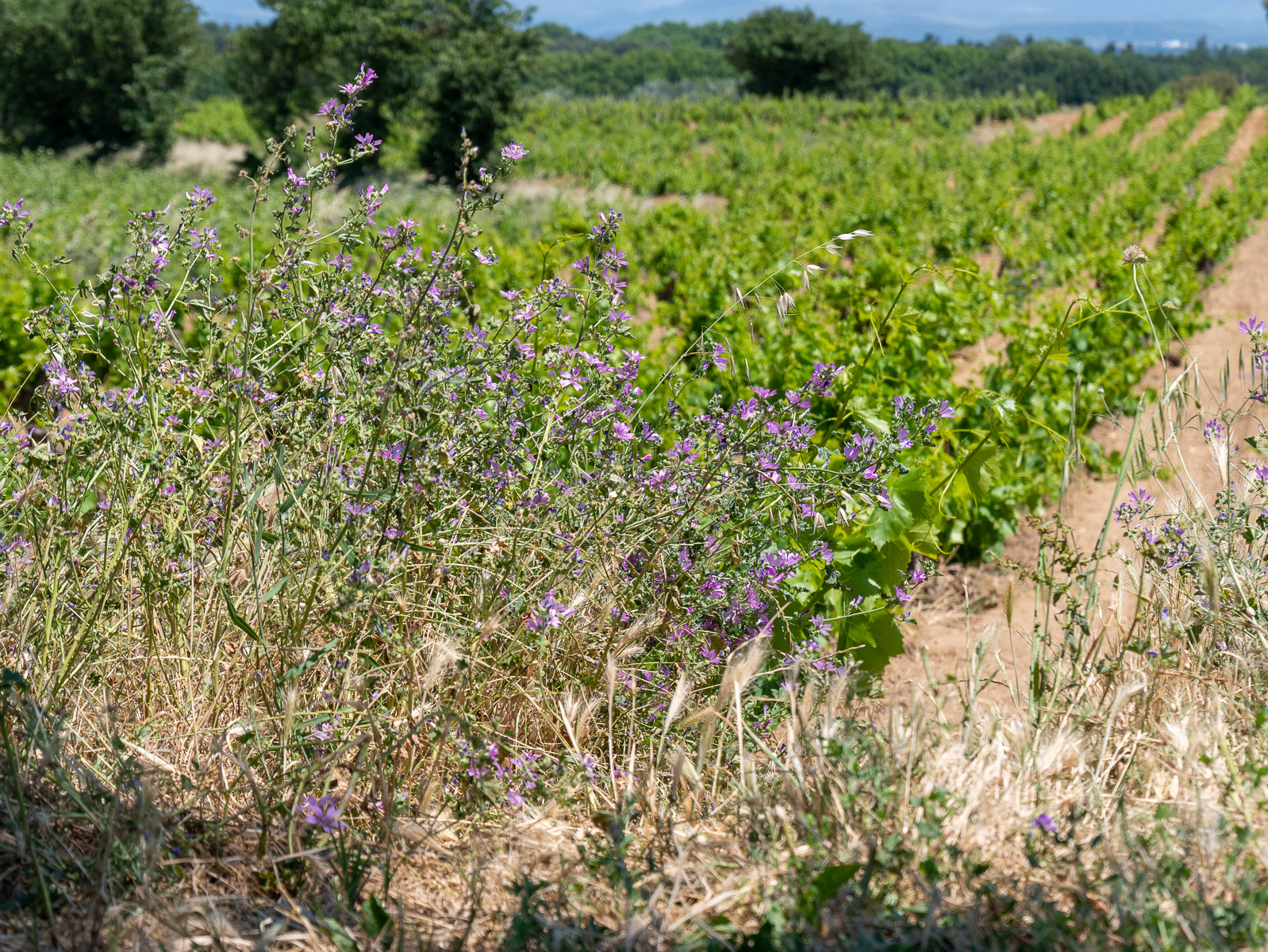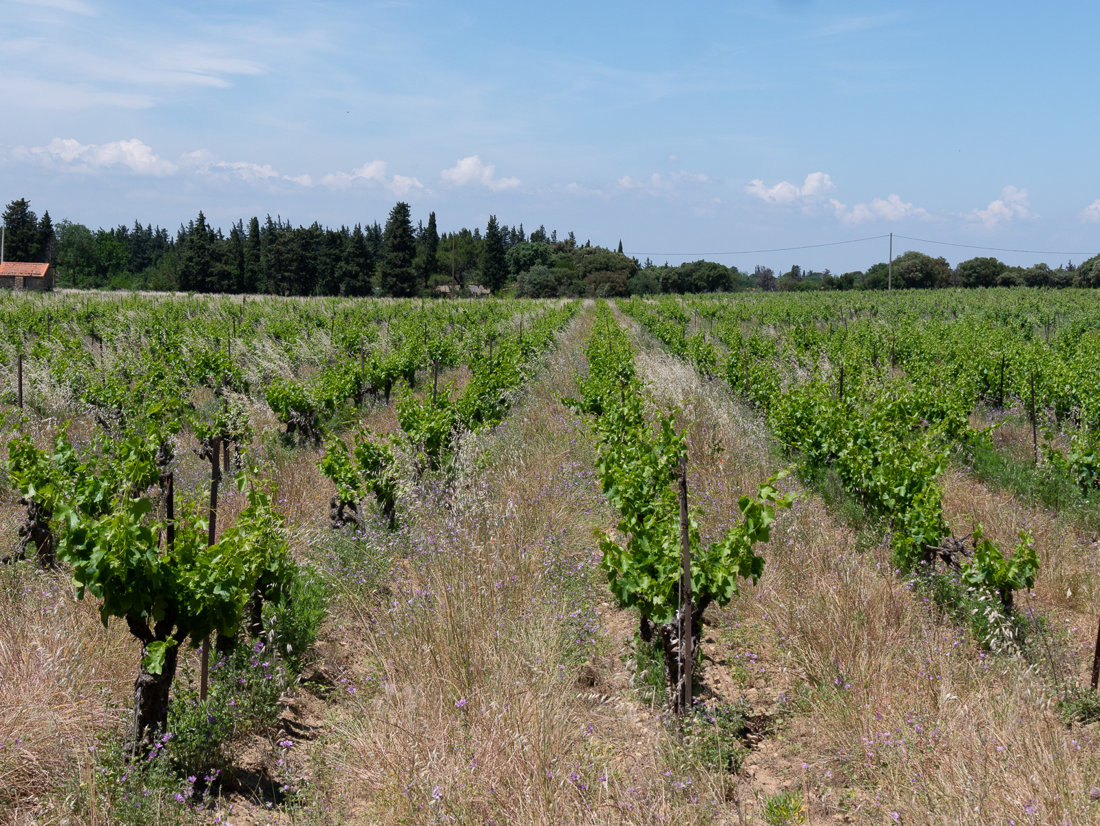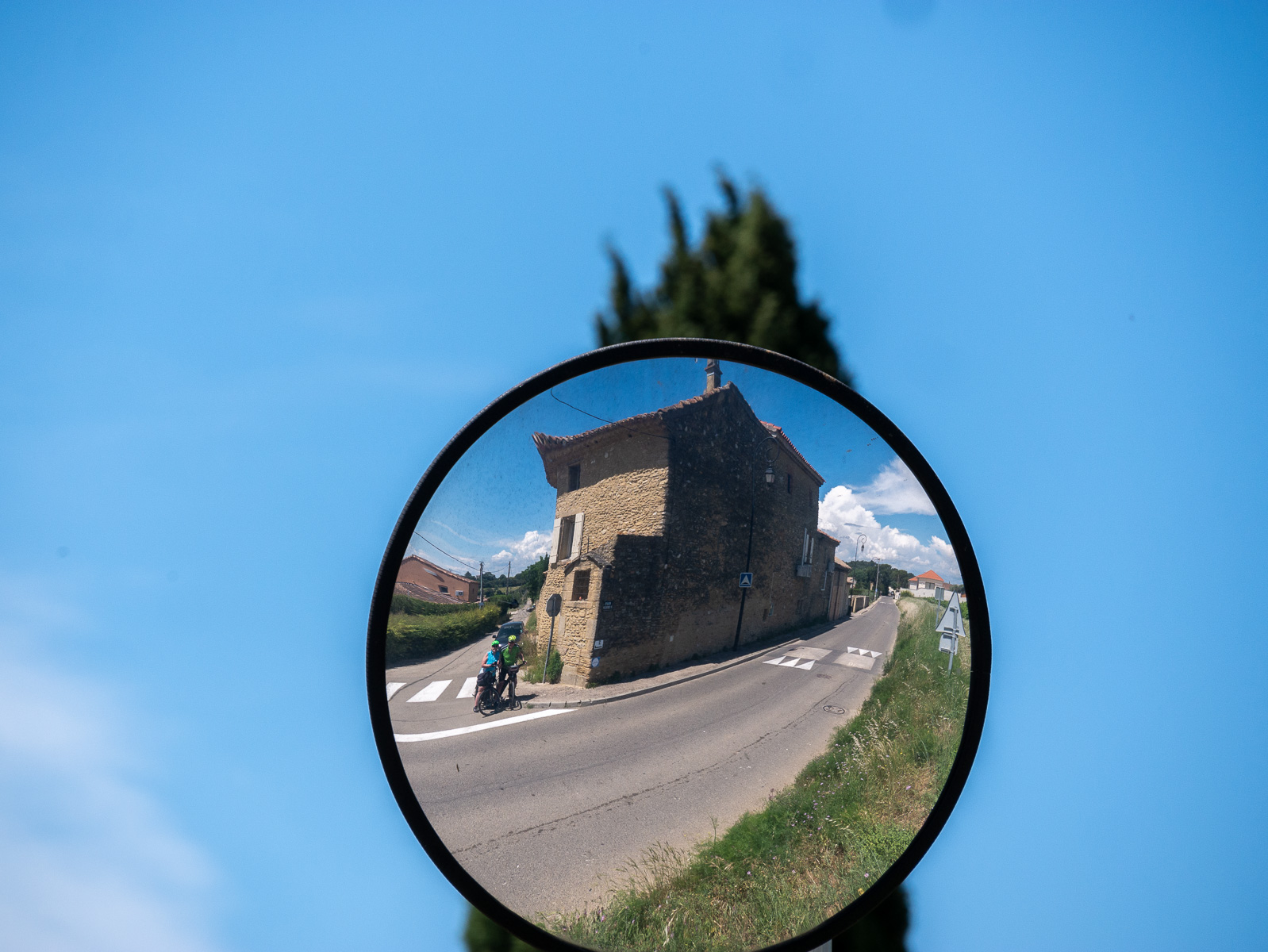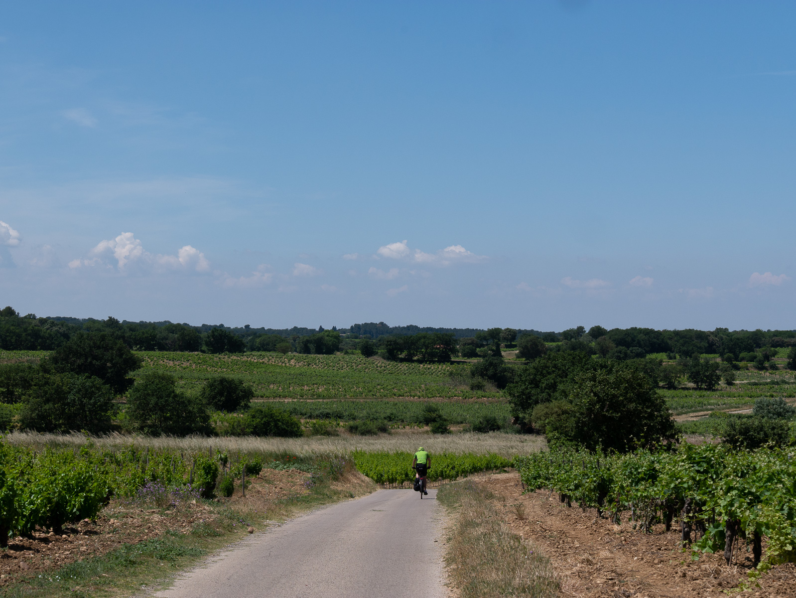 From Sorgues the circuit headed east and north, passing through vineyard after vineyard with occasional oak tree lined stretches giving us a break from the beating sun.