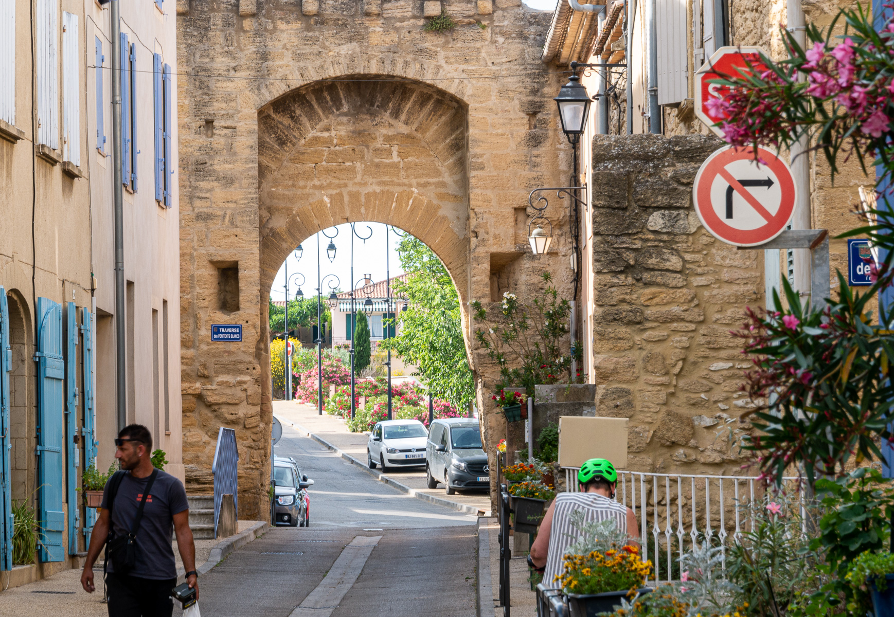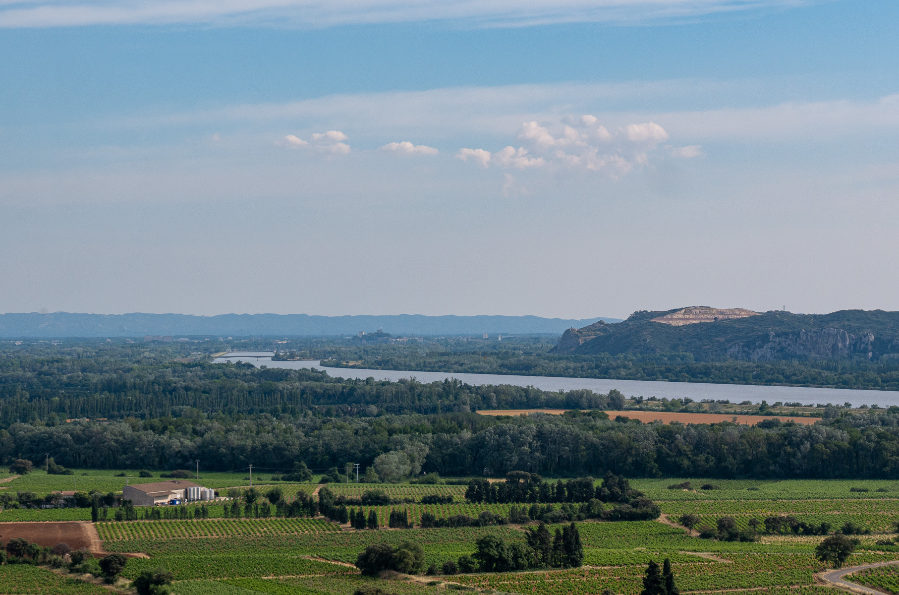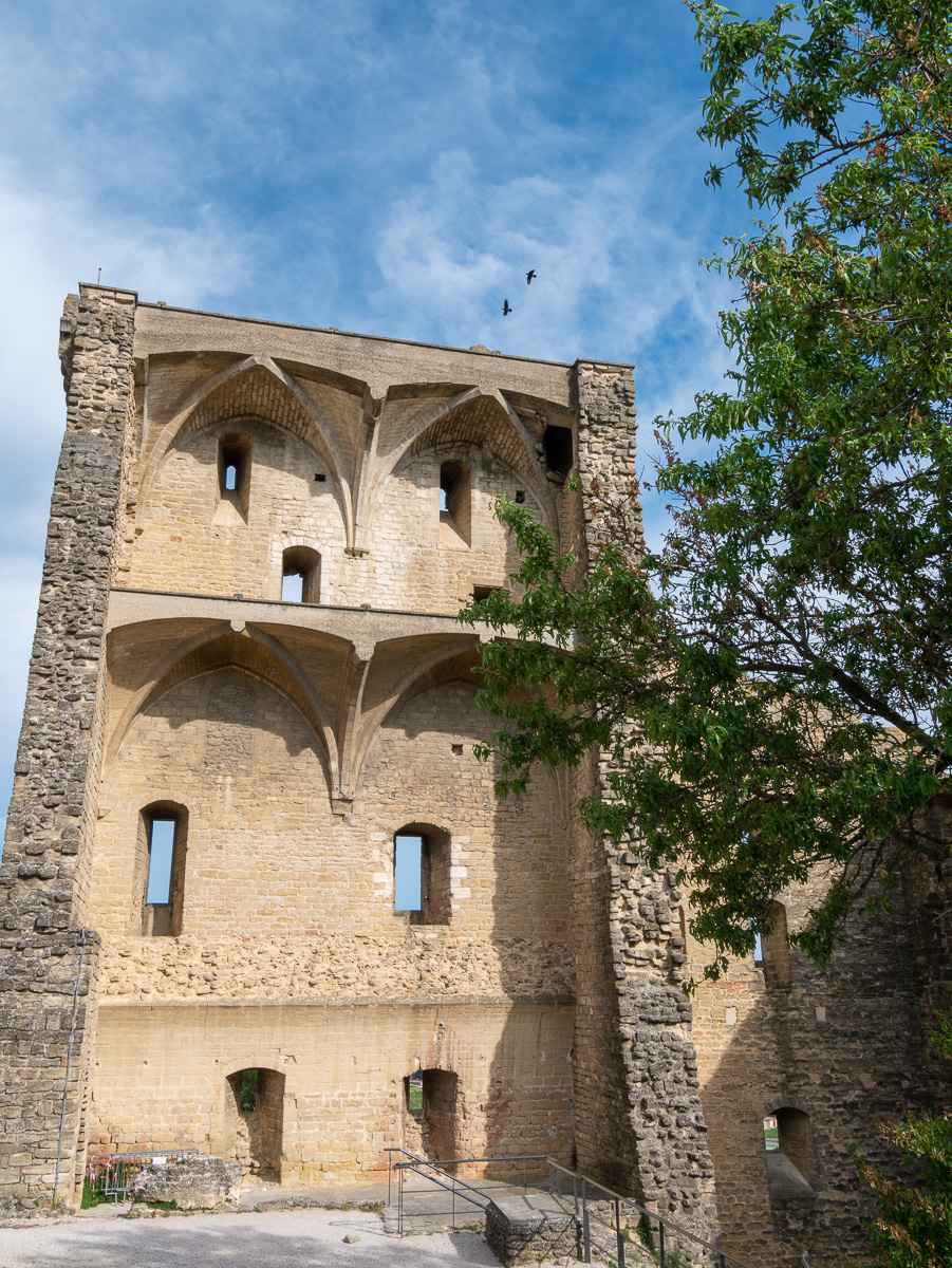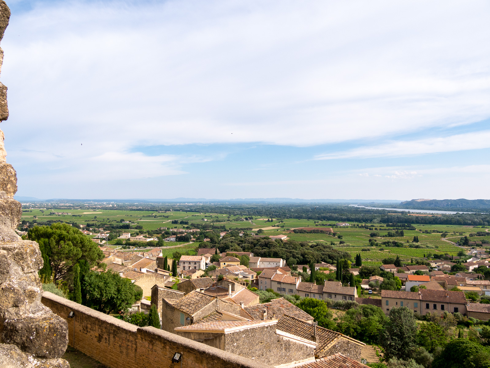 Towards the end of the afternoon we decided it would be rather dumb to spend 5 nights 1.5km from Chateauneuf-du-Pape and not visit the town, so we took a ride up the hill, checked out the village and rode on up to the castle ruins which had been part of our journeys for the past few days. The castle was built in the early Middle Ages and had many owners over the years, including one of the Avignon popes, John 22nd. Today it’s just a ruin, but nevertheless impressive and from the ramparts there’s a fantastic view up and down the Rhone valley and of miles and miles of vineyards.
