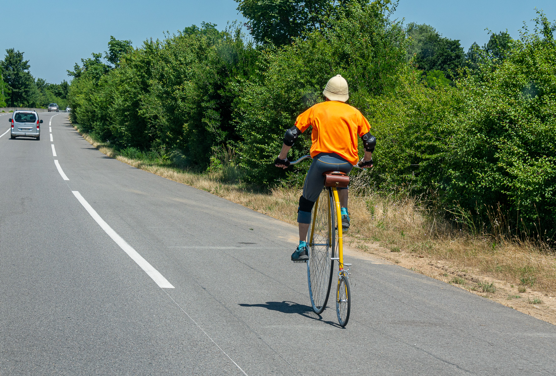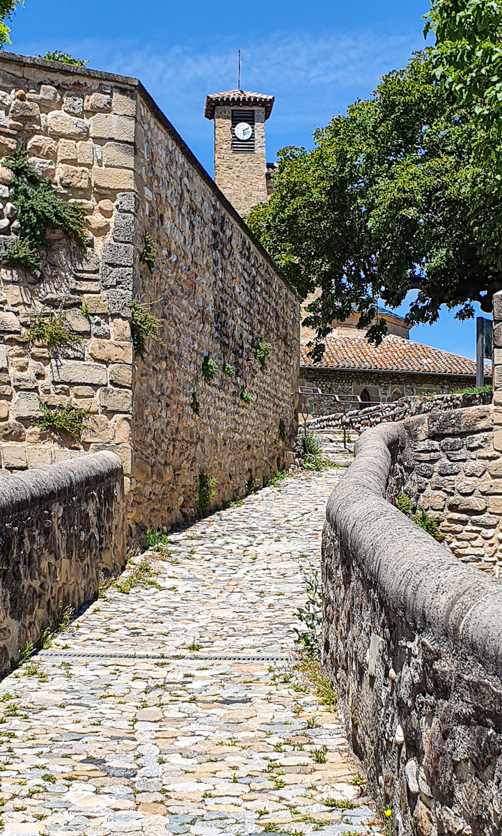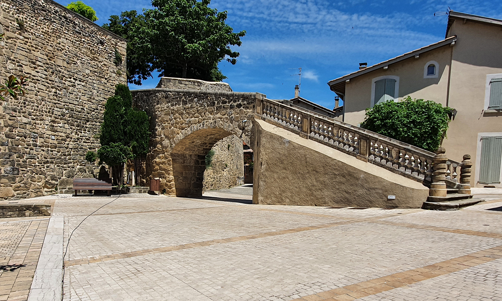 Beim Zurückfahren ein Schild:: Strasse gesperrt am? Wegen Tour de France. Das war schon lang unser Traum einmal die Tour live zu sehen. Sara schaute, die kommen in 2 Tagen hier ganz nah vorbei. Sara sagte, wir fahren ein kleines Stück und machen Picnic. Also fuhr ich eine ziemlich schmale Landstraße. Irgendwie kam es mir komisch vor. Ich sagte, in diesen verdammten Dörfern gibt’s kein Restaurant. Sara, ich meinte, wir bleiben wo stehen und ich mach ein Sandwich. Und dann gabs Crash. Einzelheiten Stillschweigen vereinbart. Meine Reaktion, sofort zurück zur Autobahn. Dann kamen wir durch Alixan. Wir stoppten an einem Parkplatz. 2 Restaurants offen, aber in beiden Küche geschlossen. Frust pur. Interessante Treppe zu einer Kirche und Aussicht. Am einzigen Picnicplatz saßen zwei Jungs. Zurück zum Auto, Sandwich da, auch das muss man verkraften.