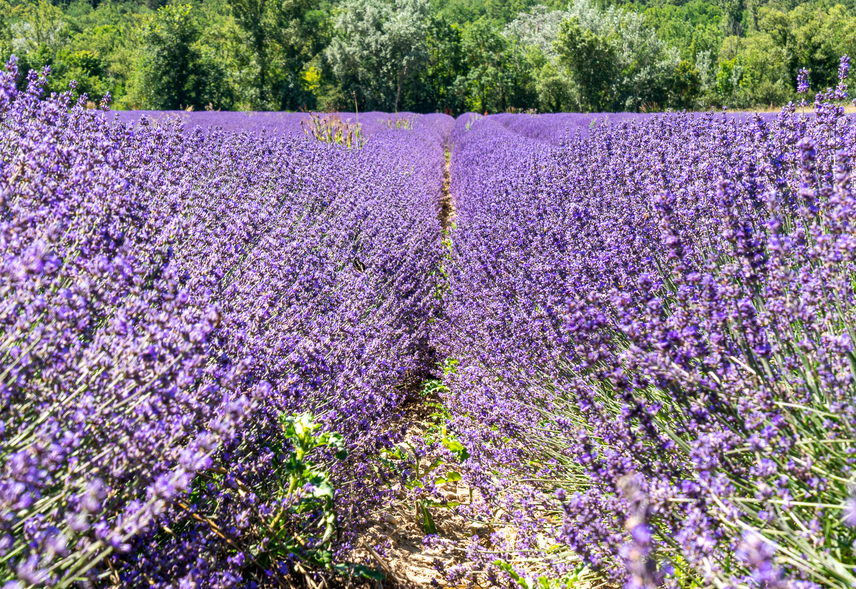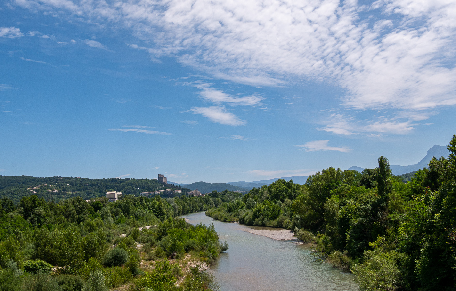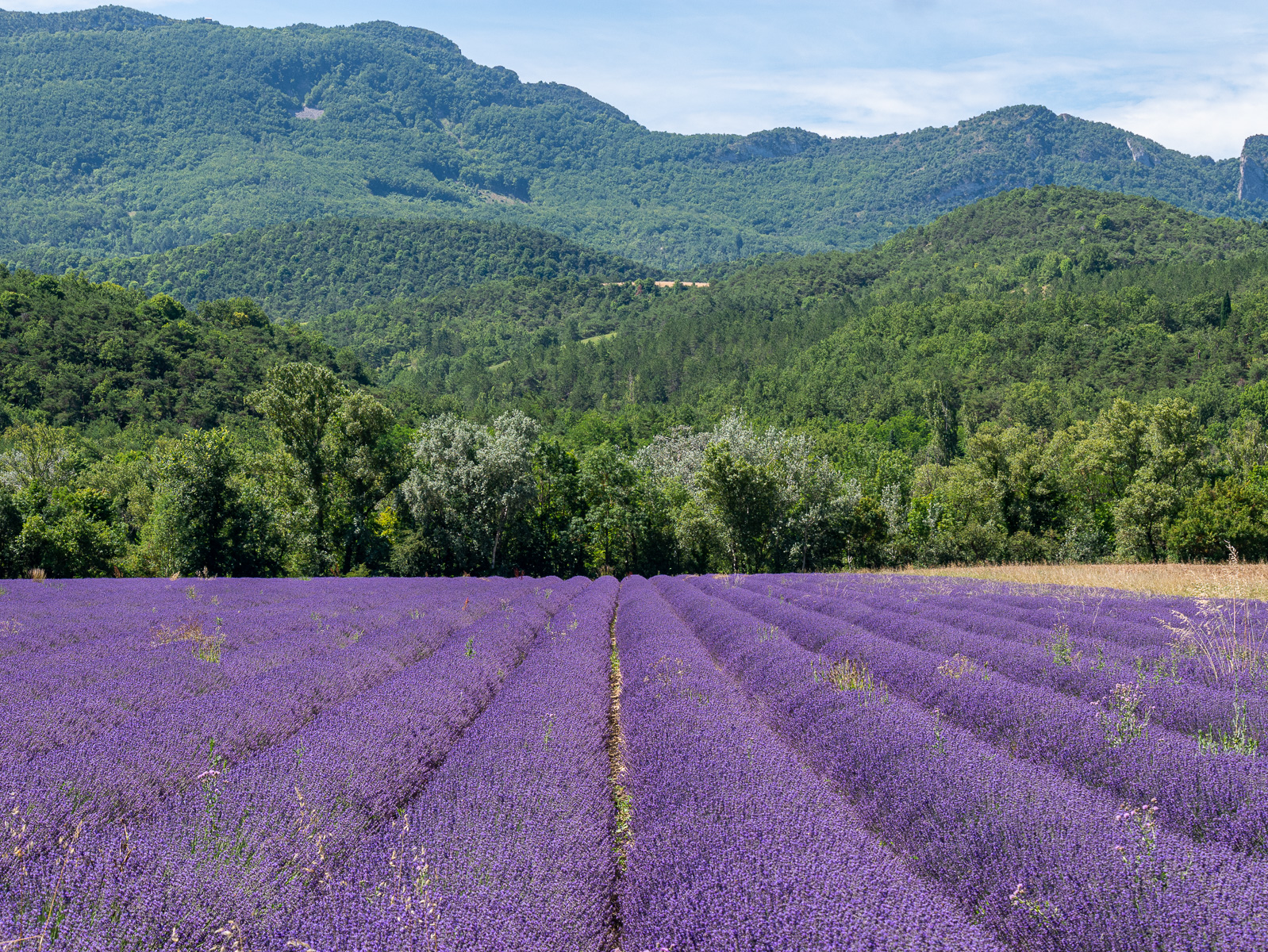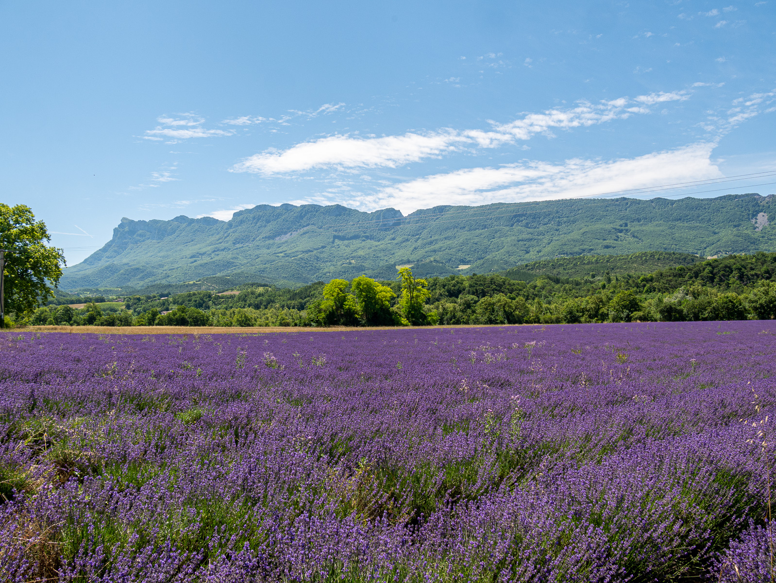 We hit the road at 11, heading roughly northeast towards the town of Crest, where lavender fields were supposedly abundant. In 45 minutes we reached Crest where we were both expecting to see the fabled lavender fields stretching out in front of us. Hmmm… we kept following the Drôme river east towards Die. While there was an isolated field or two, our expectations for lots of lavender were not met. Hmmm… we kept driving, thinking “around this next curve…” and as usual, there were lots of curves.