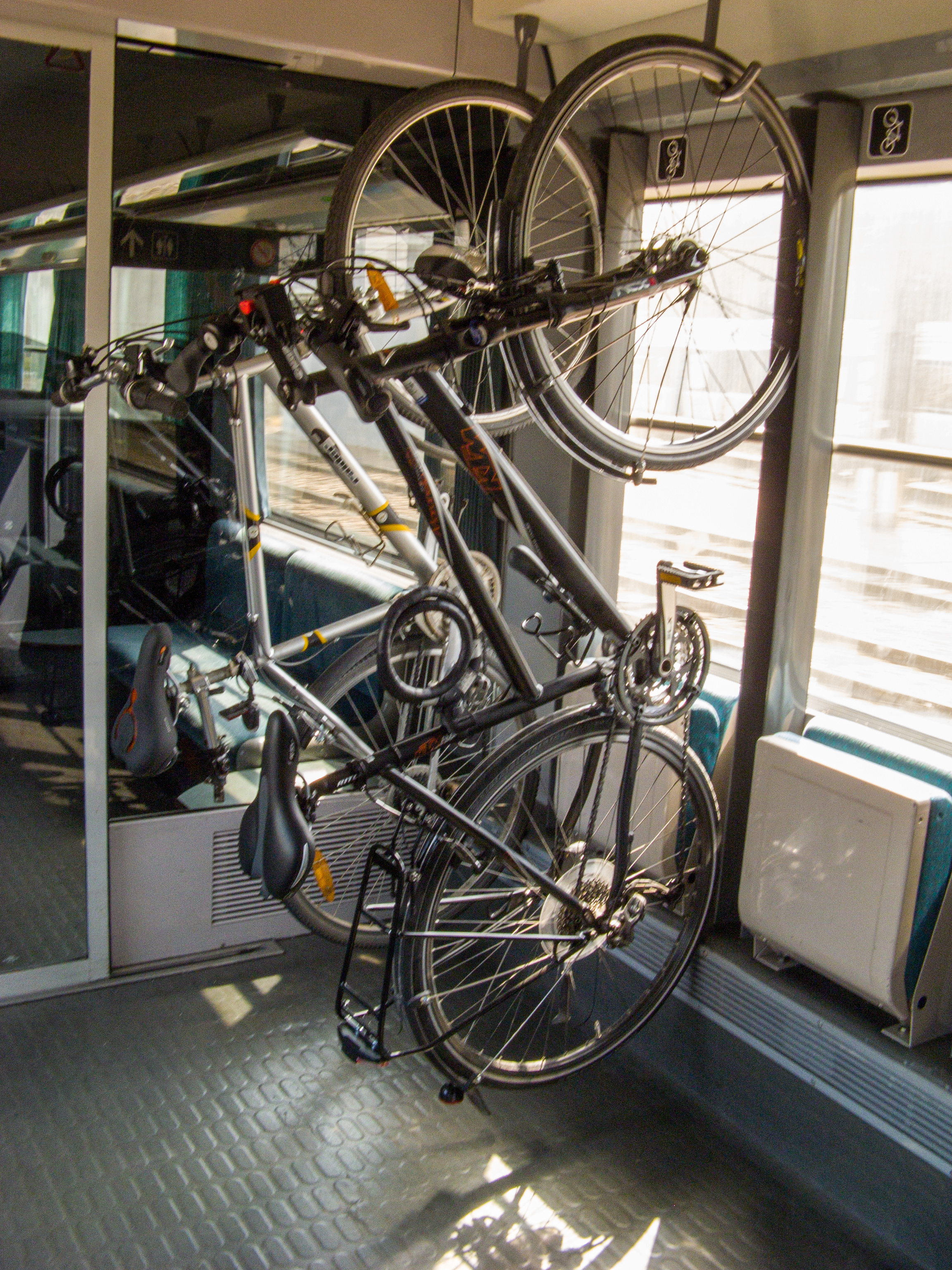 Getting on the train to Tours was somewhat of an adventure. There were 6 of us bikers waiting on the platform, all fully packed. The train conductor came up to us and told us that there may not be a train compartment on the incoming train and that we weren’t to block the aisles with our bikes. Naturally we were all a slight panicked and a bit irritated by this. Then the train rolled in complete with bike compartment, much to our relief, but when the train stopped the bike compartment was at completely at the other end of the platform from us. So we all took off, trying to run with the bikes with our panniers in our hands (we’d already taken them off to prepare for mounting the train). Now keep in mind that it was close to 100 degrees. I was feeling a bit wilted. Thanks to biker teamwork we all made it onto the train (it was one where you had to really lift the bike up steep steps through narrow doors). On the positive side, the train was air-conditioned, so the hour’s ride to Tours was quite comfortable.